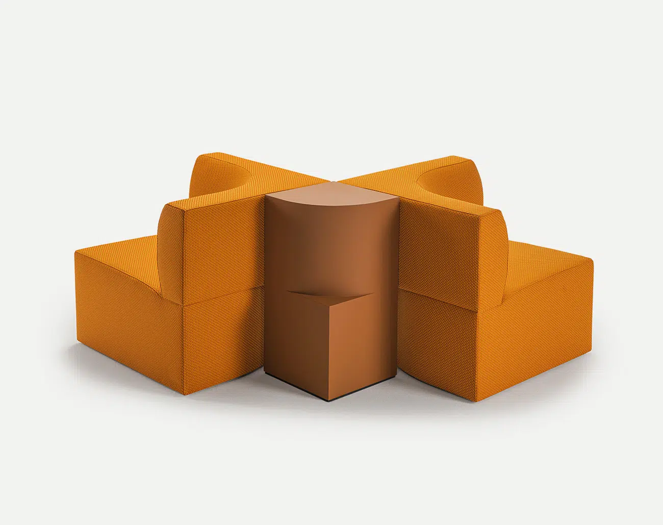Každý modul se zdá být vytesán přímo z kamene z lomu: čtvercový blok, pevný a kompaktní, rozdělený zakřiveným řezem na dvě části, které se poté překrývají, aby vytvořily opěradlo a sedátko. Je doprovázen totemovým malým stolem. Téměř jako monolit, design stolu také pracuje s úhlovými a zaoblenými tvary.