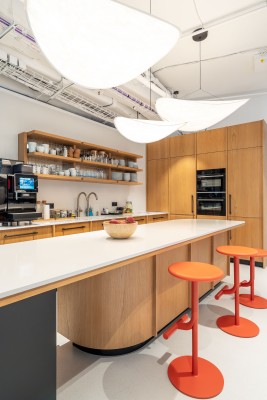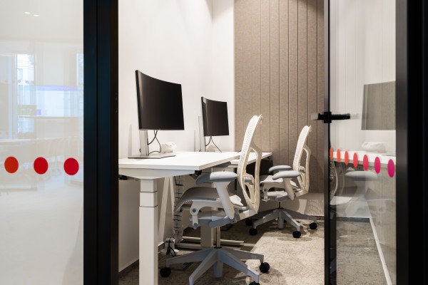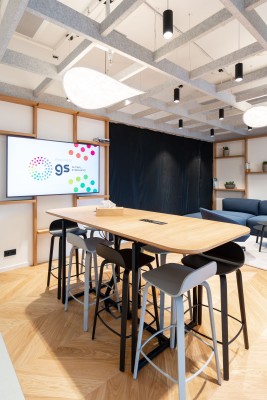 Pracovnímu prostoru vévodí ergonomické židle HermanMiller MIRRA, které už dle svého jména dokonale zrcadlí pohyb uživatele a poskytují mu tak maximální a správnou ergonomickou podporu během dlouhodobého sezení. V kombinaci s výškově stavitelnými stoly NEVI a rameny na monitor OLLIN tvoří dokonalé moderní pracoviště. Akustický komfort pomáhají zajišťovat v otevřeném prostoru produkty značek Framery a EchoJazz. Oblast softseatingu zastupují designové kousky značek Arper, Muuto a HAY. Sklopné skladné stoly Trilogy pomáhají řešit flexibilitu prostoru a nabízejí svou mobilitou nové možnosti set upu místností.