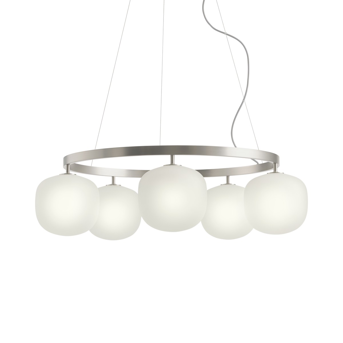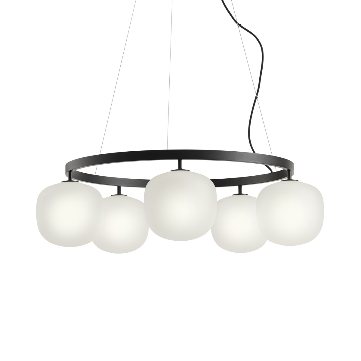 The Rime Rail or Chandelier creates a rhythmic play of light by connecting Rime lamps into a chosen composition. Their softly diffused glow and even illumination carry attention across the space, balancing function with atmosphere. Hand-blown glass and a durable powder-coated rail or circle add depth and tactile quality, making the light a refined yet striking element above dining tables, kitchen islands and in meeting rooms.