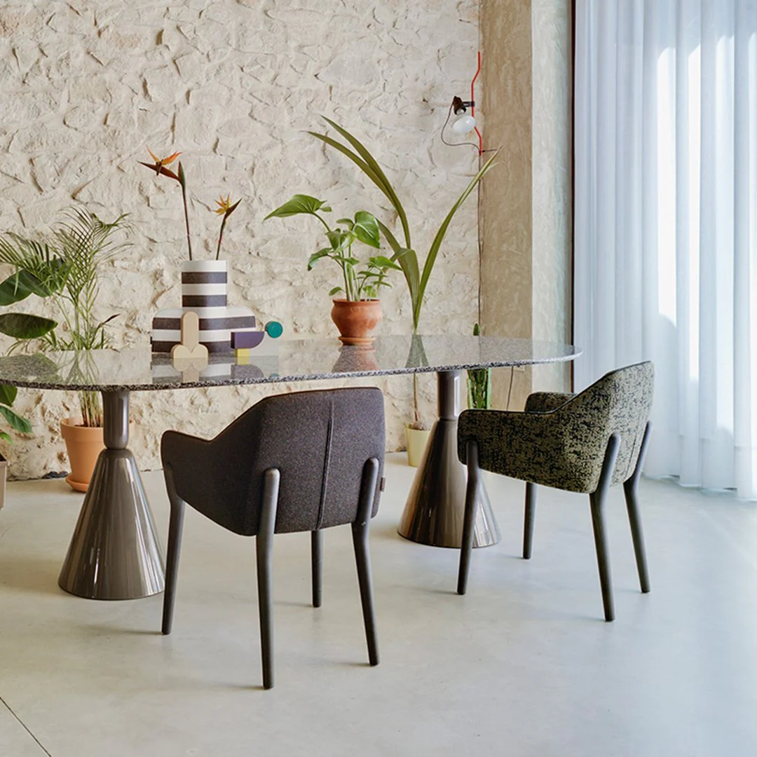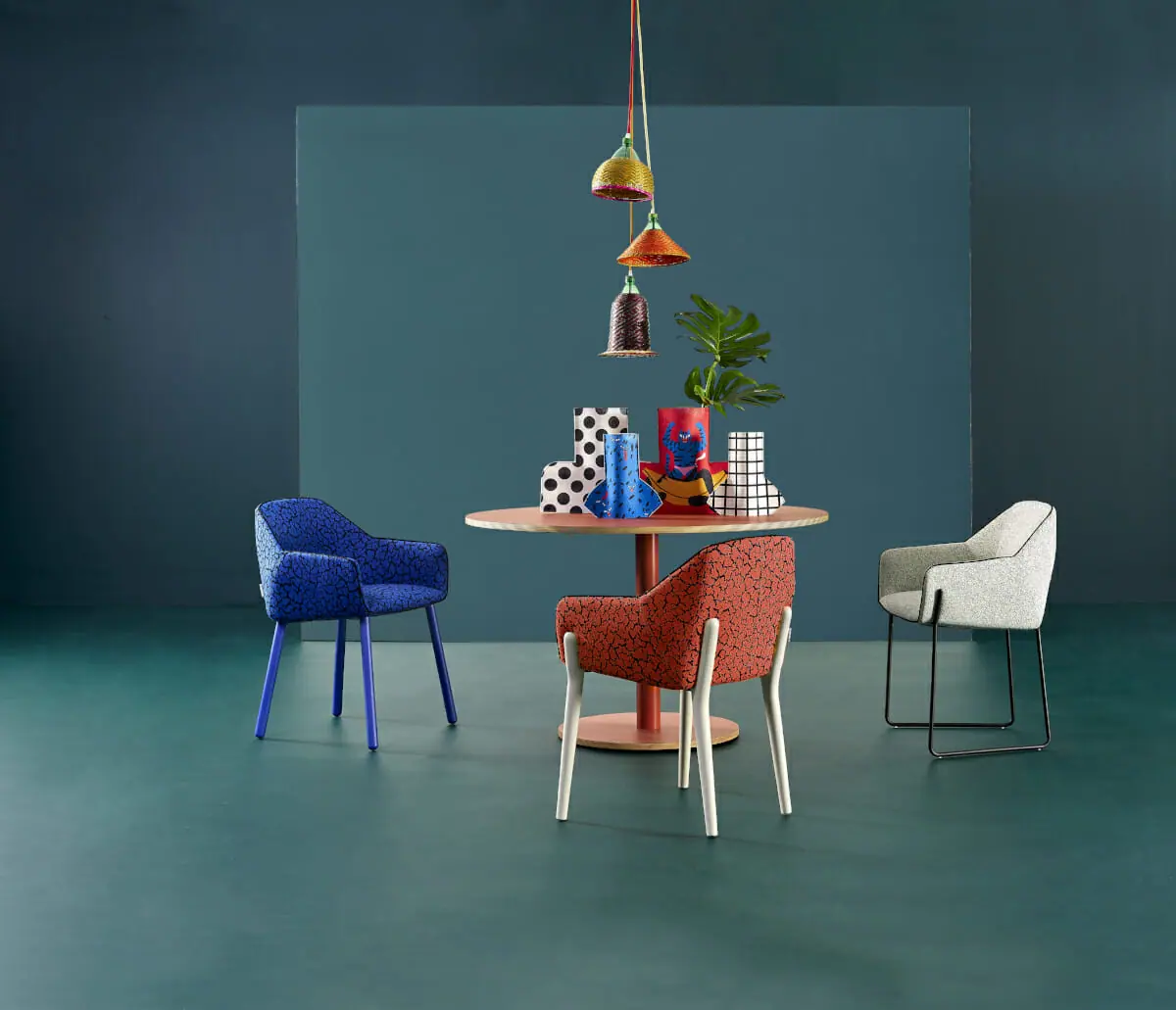 The small NIDO chair has found inspiration in the shape of bird nests and its legs in the branches of a tree. Frame and legs are available in different colors and decors. A new alternative is also the series with metal legs in matt black, gray or brown color.