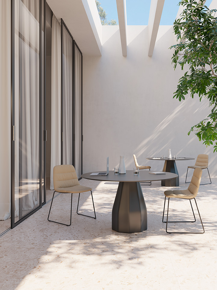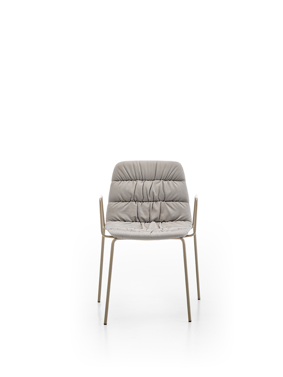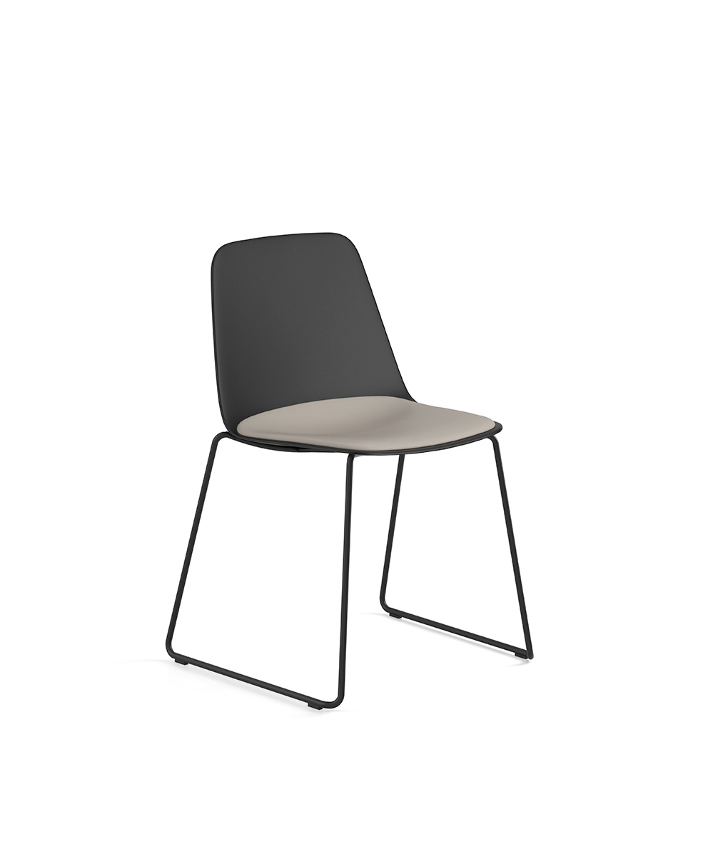 Collaborative Maarten chair with sled base, upholstered in outdoor fabric, convenient for controlled exterior use. Maarten is an ideal chair for collaborative spaces, hotels, restaurants, offices and homes. The smooth outlines of its silhouette embrace the back properly, achieving long-lasting comfort.