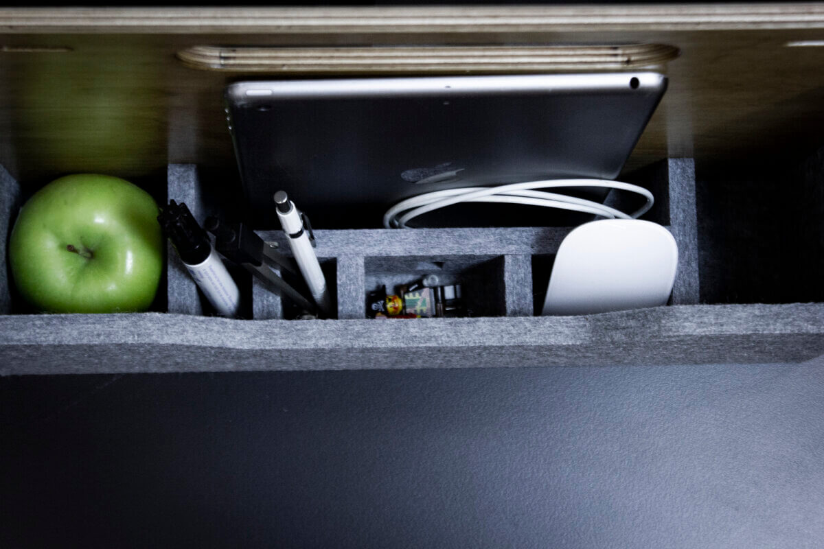 Na pracovišti máte notebook, příslušenství, kancelářské materiály i soukromé věci vždy dobře uklizené a snadno po ruce díky dvěma úložným pozicím. Integrovaná rukojeť umožňuje na konci pracovního dne organizér rychle uložit do přihrádky nebo skříně. Elegantní kancelářský společník je vyroben z akustického absorbéru EchoBoard® kolem stabilní dřevěné desky z evropské břízy. Při používání je velmi tichý a tlumí okolní hluk. EchoCarry symbolizuje zaměření na ergonomii v moderním mobilním pracovním prostředí.