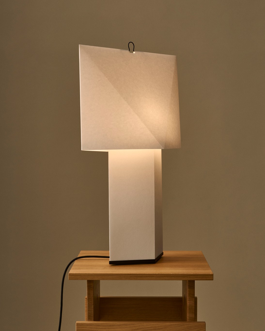 Aplat Table Lamp je lehká, sochařsky pojatá lampa vyrobená převážně ze skládaného papíru. Díky plochému balení si ji uživatel sestavuje sám – přesné linie a úhly postupně vytvářejí objem a dávají vzniknout jednoduché, grafické formě.