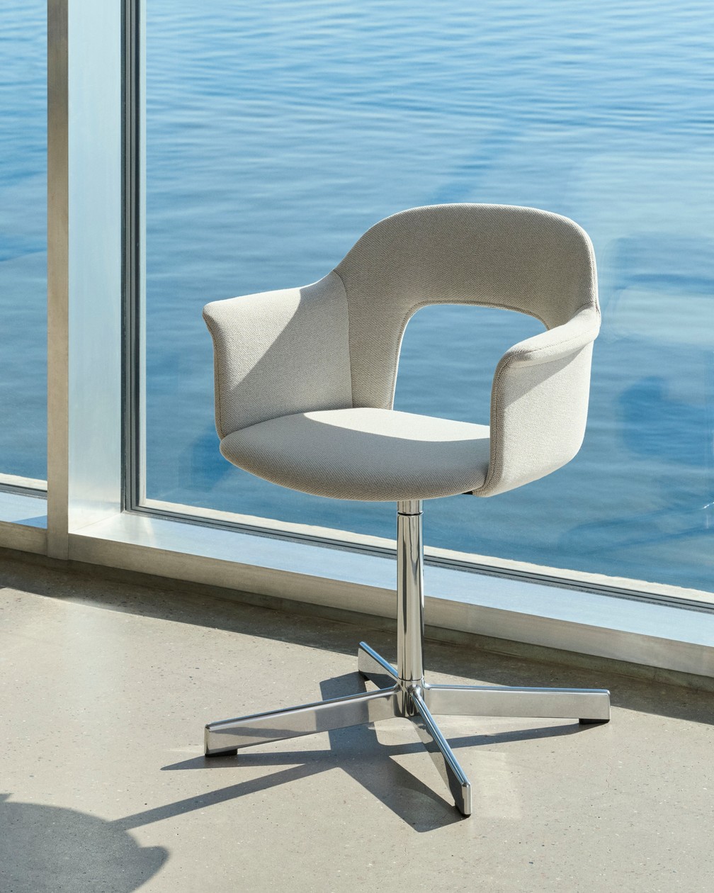Navržené Julienem Renaultem, Layout Armchair 232 nabízí flexibilní a inovativní design, který vychází ze závazku k pohodlí, funkčnosti a udržitelnosti. Charakteristickým prvkem je otvor v opěradle, který zvyšuje pohodlí a zároveň dodává vzhledu lehkost a vzdušnost. Sedák z překližky přináší přirozené teplo, zatímco elegantní otočná čtyřramenná základna zajišťuje stabilitu a snadný pohyb. Všechny komponenty jsou navrženy tak, aby je bylo možné rozebrat, čímž se prodlužuje životnost a umožňuje renovace pro dlouhodobé využití. Skořepina je vyrobena minimálně z 96 % recyklovaného plastu z koncových výrobků a je nabízena v široké škále barev. Sedák je k dispozici v několika provedeních a hliníková základna může být leštěná nebo práškově lakovaná, díky čemuž je Layout univerzálním a odolným řešením pro většinu firemních i domácích prostředí.