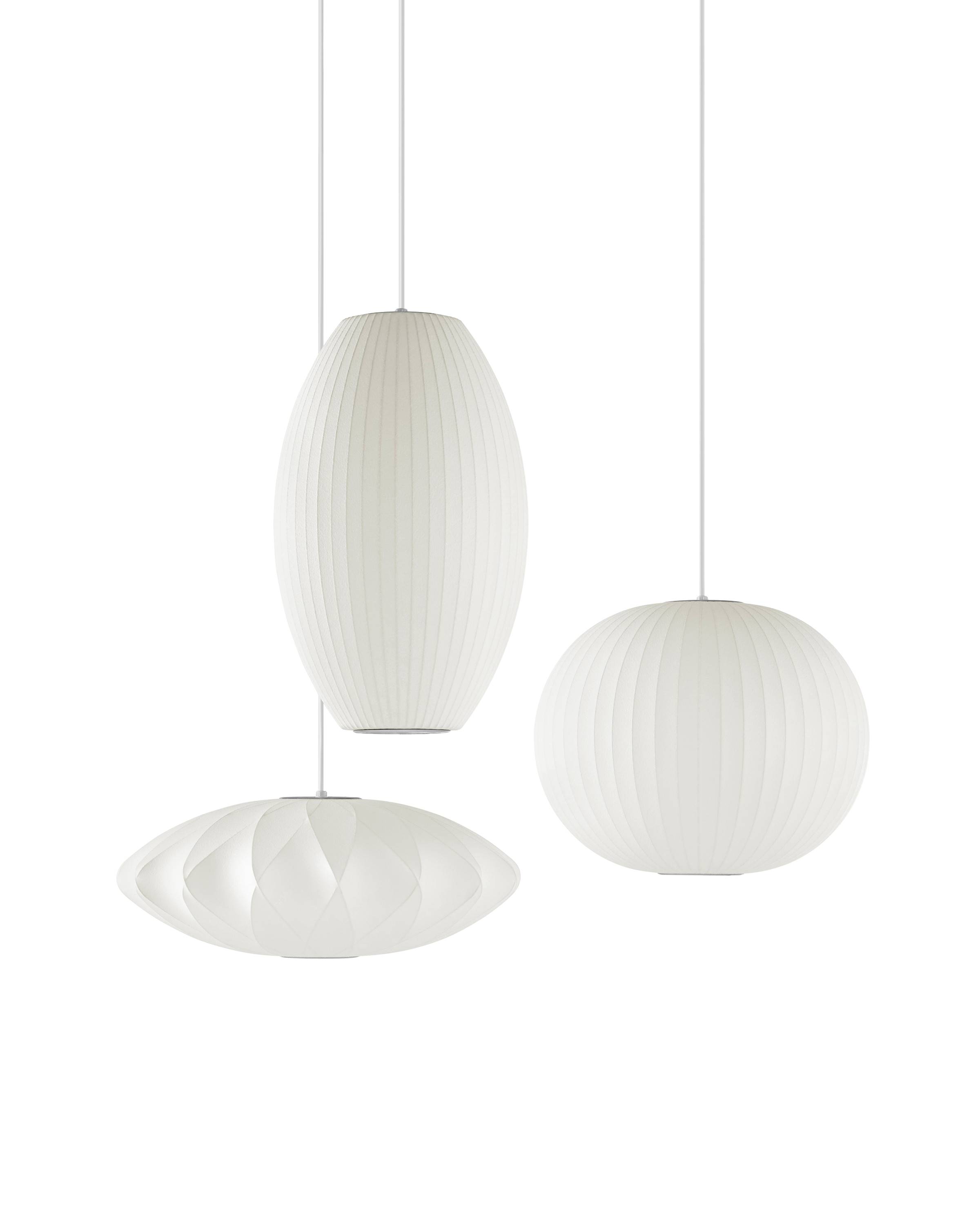 Nelson Bubble Lamps, sortiment světel v různých kulovitých siluetách, dodává interiérům nádech jemnosti a jasu. Tato elegantní svítidla jsou vyrobena z robustního, lehkého ocelového rámu a přesto mají jemnou, vznášející se podobu. Povrch je nastříkán pryskyřičným lakem. Dostupné jsou jak závěsné varianty, tak i varianty