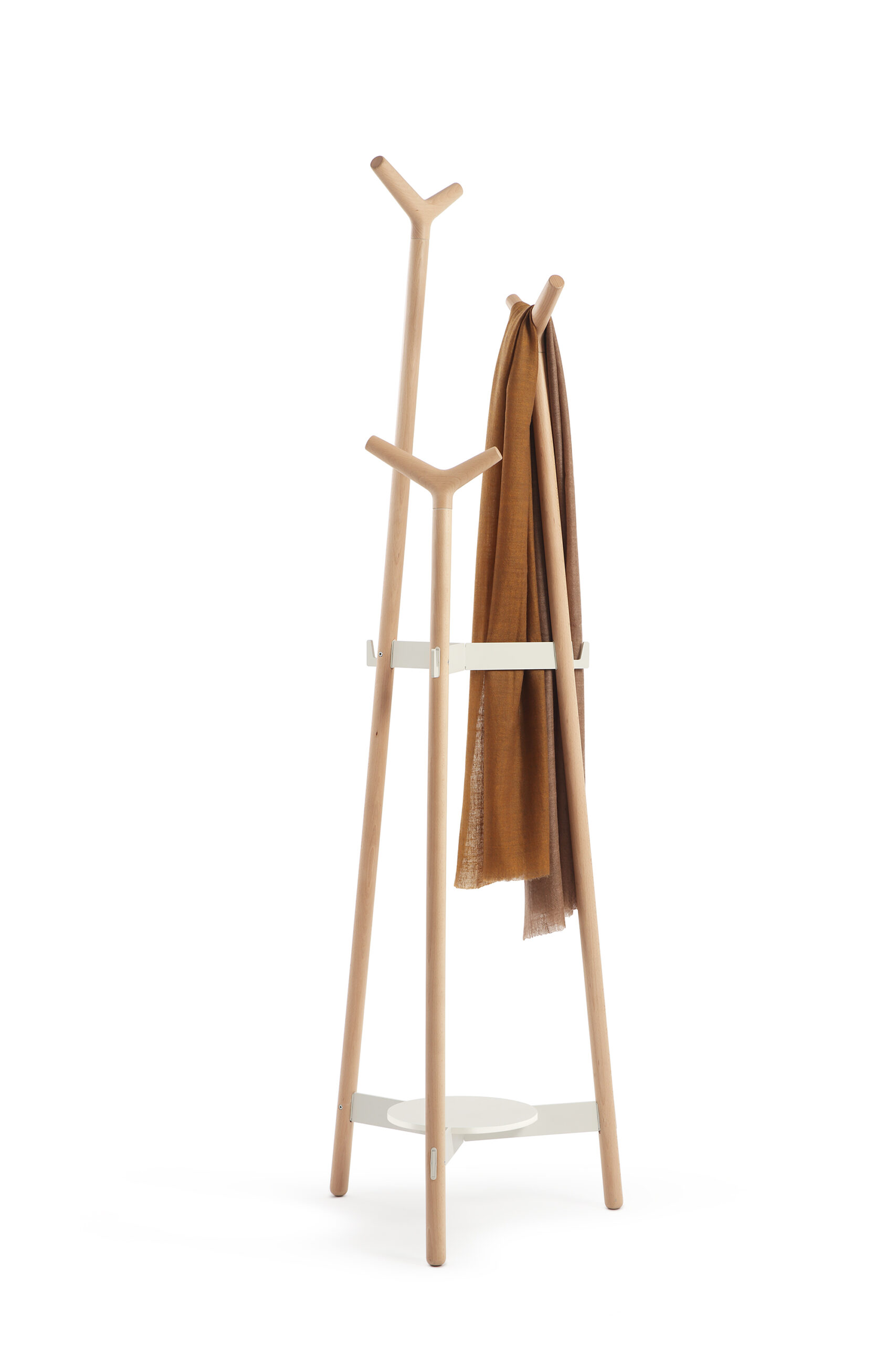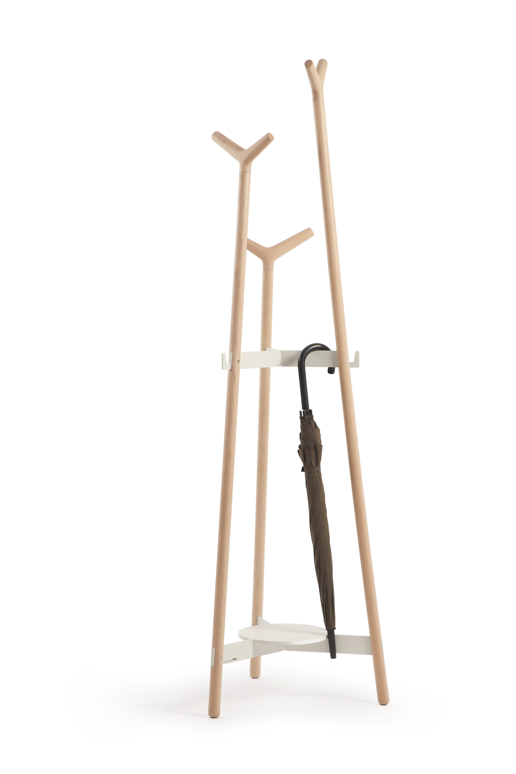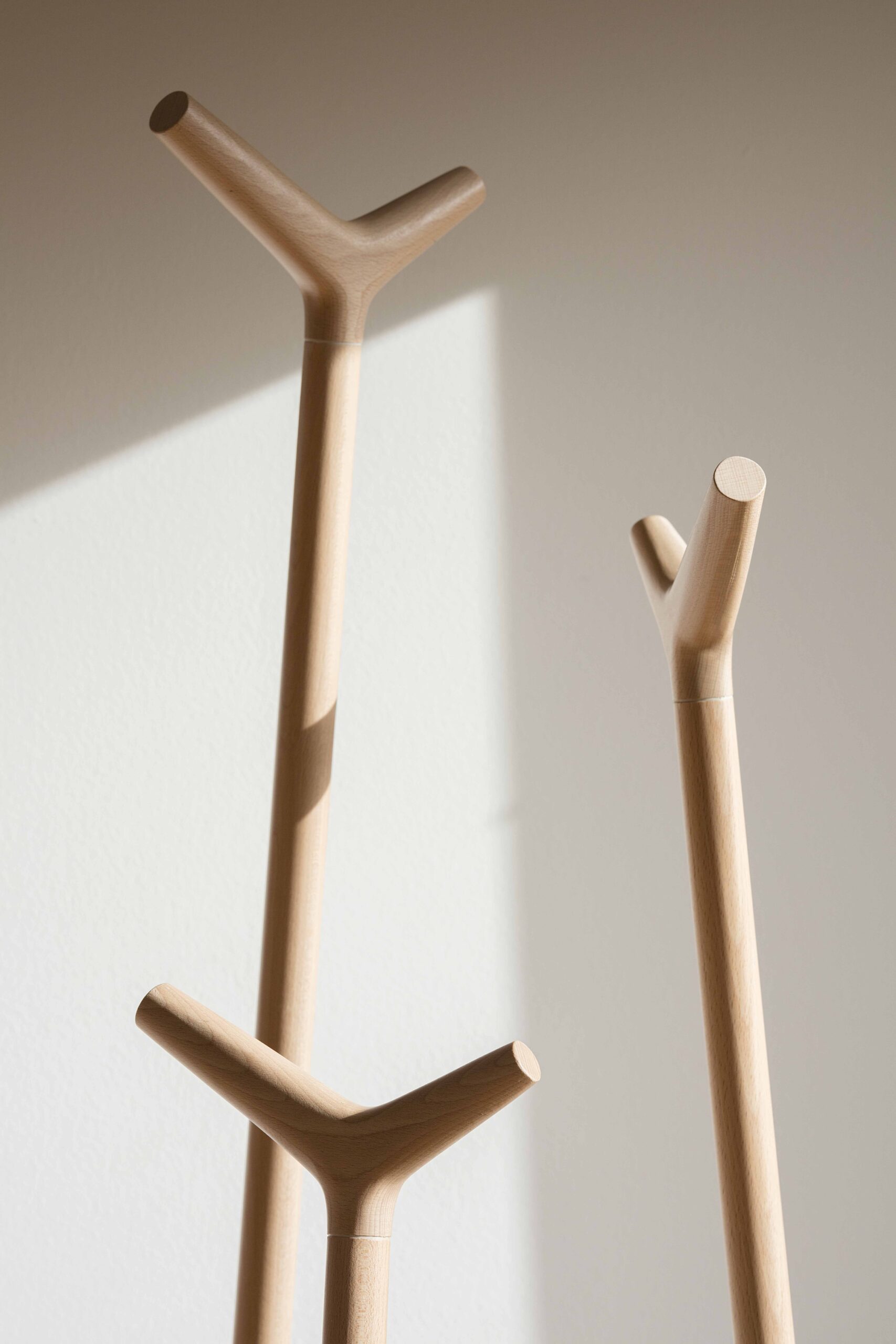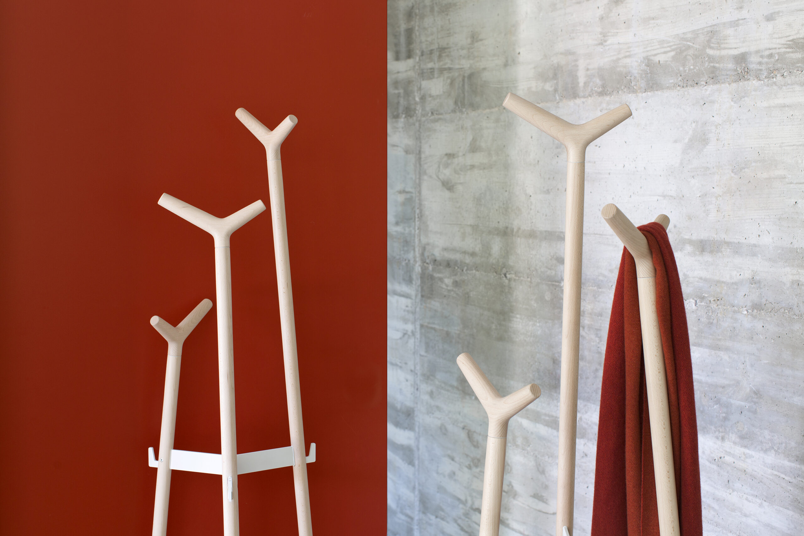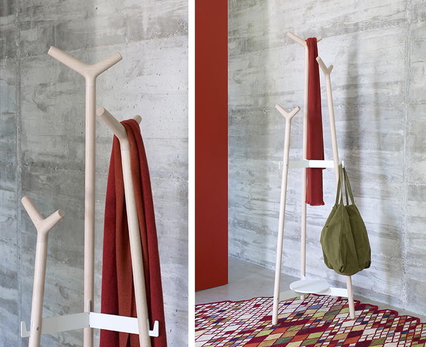 Skládají se ze tří soustružených tyčí o průměru 32 mm v různých výškách: 176 cm, 157 cm a 130 cm. Tento tvar optimalizuje kapacitu věšáku a zajišťuje komfort pro uživatele. Všechny prvky jsou vyrobeny z masivního bukového dřeva a dokončeny vodou ředitelným lakem.