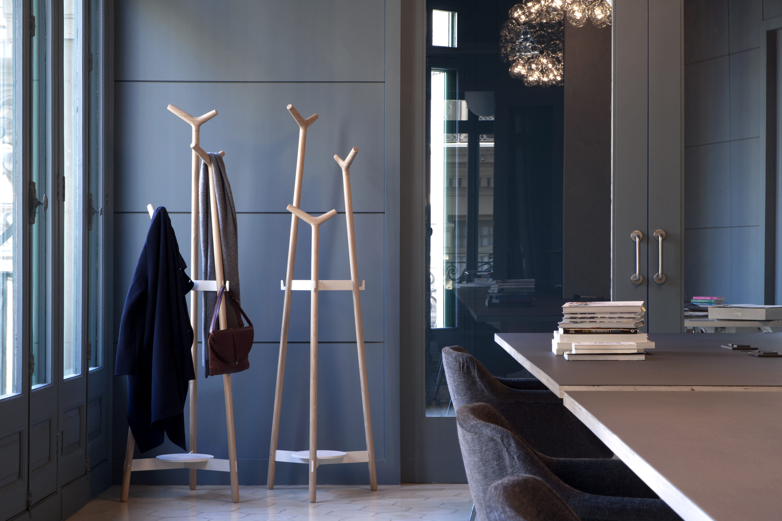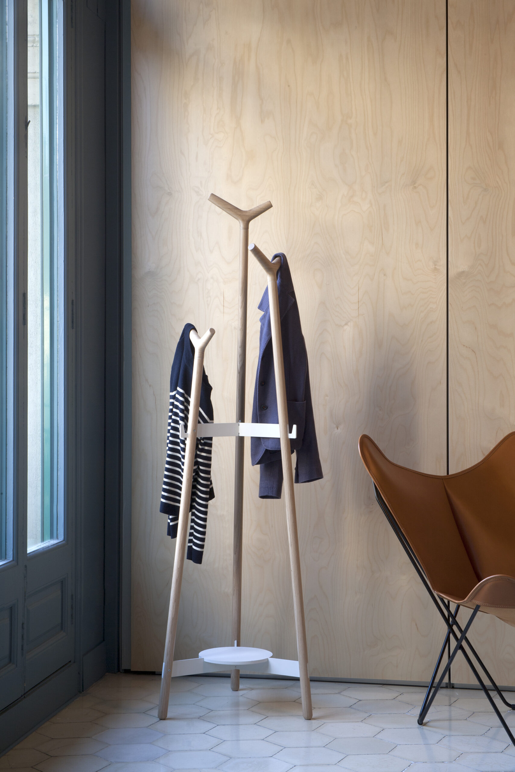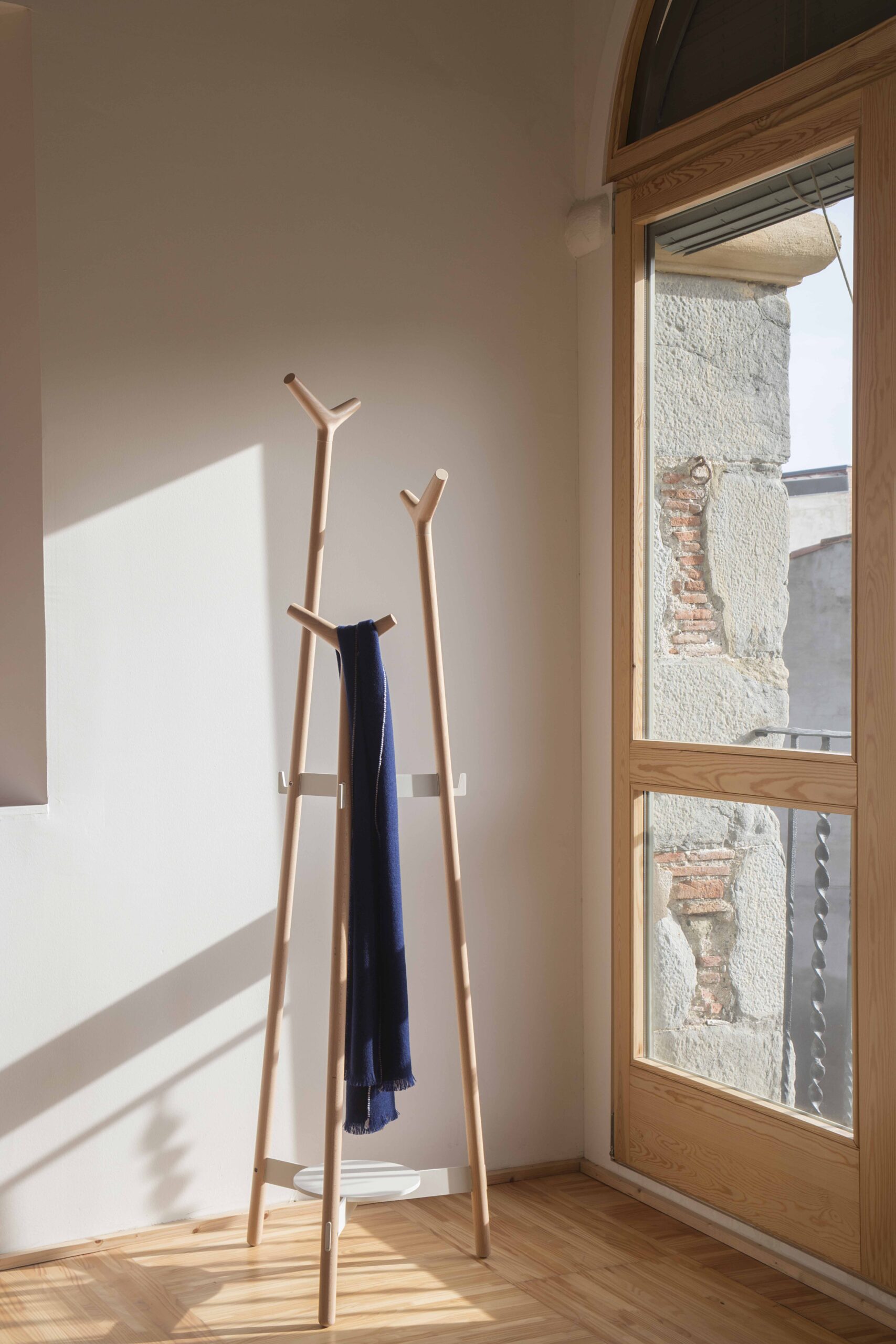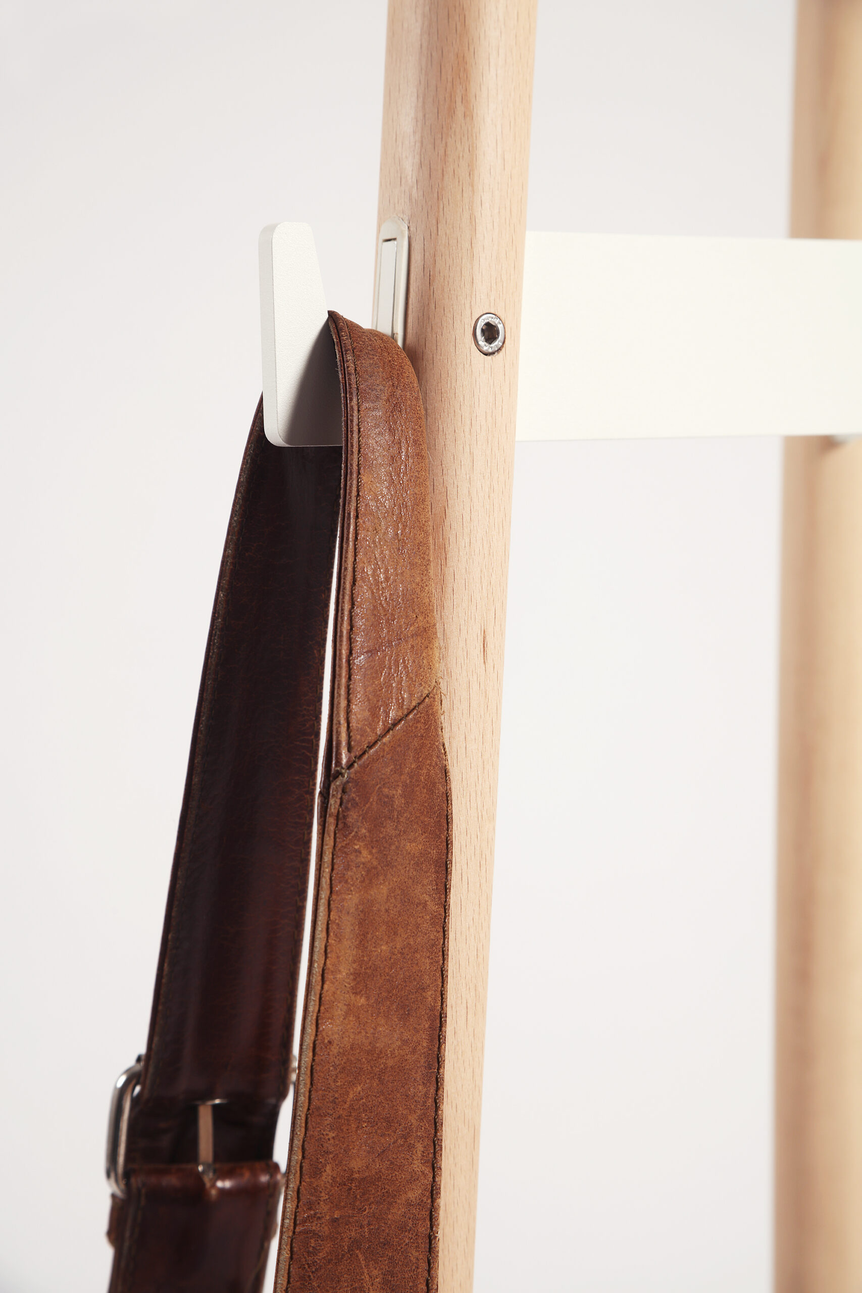 Skládají se ze tří soustružených tyčí o průměru 32 mm v různých výškách: 176 cm, 157 cm a 130 cm. Tento tvar optimalizuje kapacitu věšáku a zajišťuje komfort pro uživatele. Všechny prvky jsou vyrobeny z masivního bukového dřeva a dokončeny vodou ředitelným lakem.
