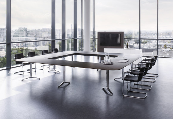 Díky modulární konstrukci stolu lze snadno kombinovat různé velikosti a tvary, od jednoduchých až po oválné, kulaté a obdélníkové uspořádání. Lehká a elegantně navržená chromovaná hliníková základna zaručuje nejen stabilitu a maximální prostor pro nohy, ale slouží také k důmyslnému propojení přilehlých stolů. Montáž a demontáž je rychlá a snadná a není k ní potřeba žádné nářadí.