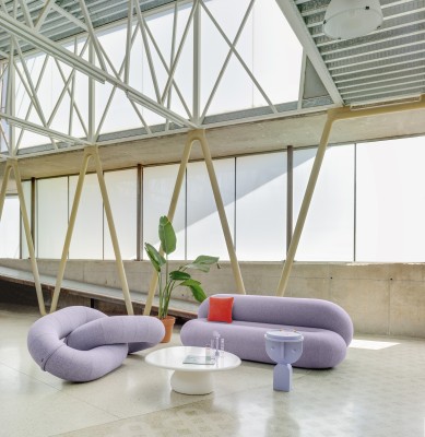 Funkční rodina stolů o více výškách nabízí použití coby příležitostný stůl nebo nízký stolek. Inovativní a flexibilní materiál, vyrobený z kamene a pryskyřice, kopíruje tvar říčních oblázků.