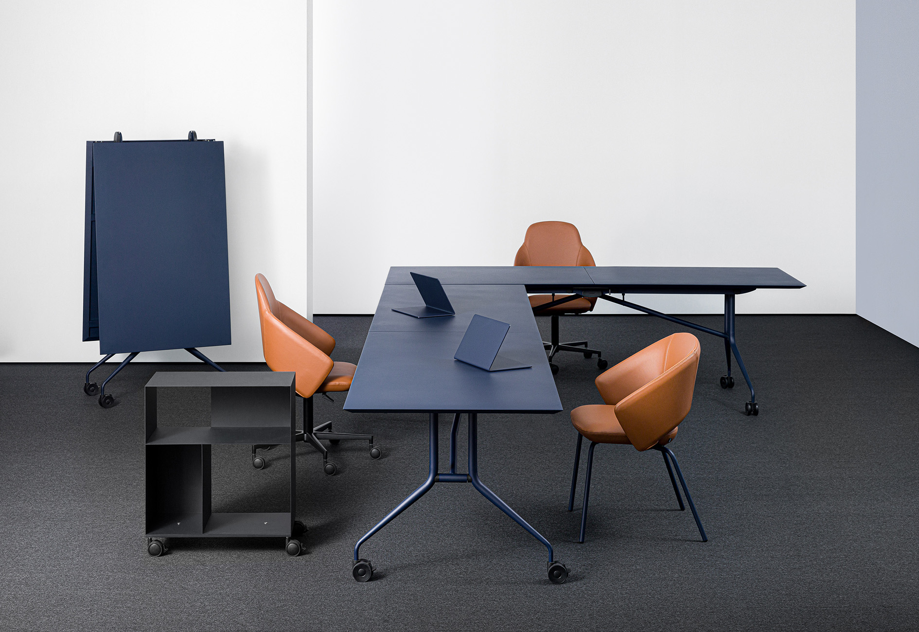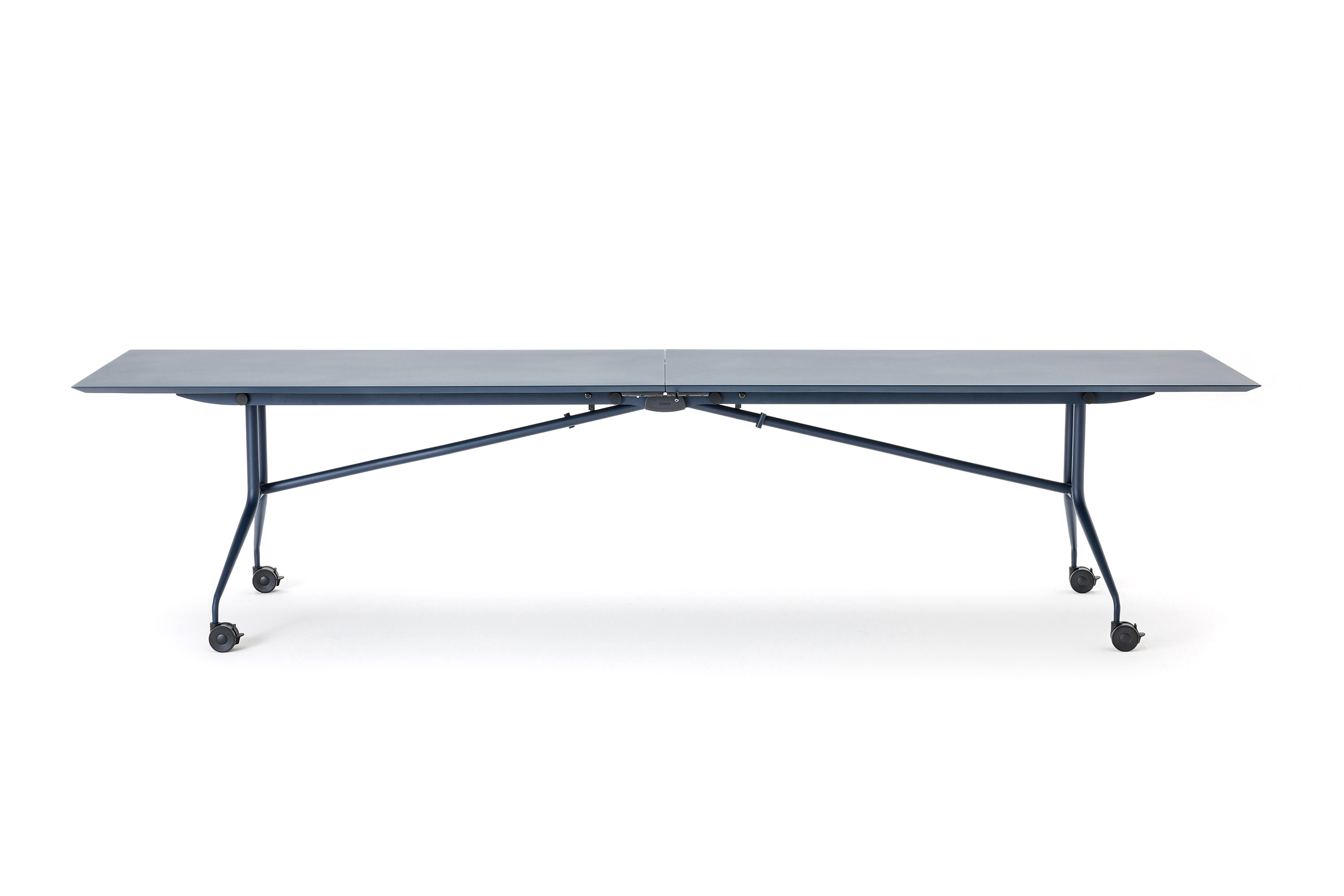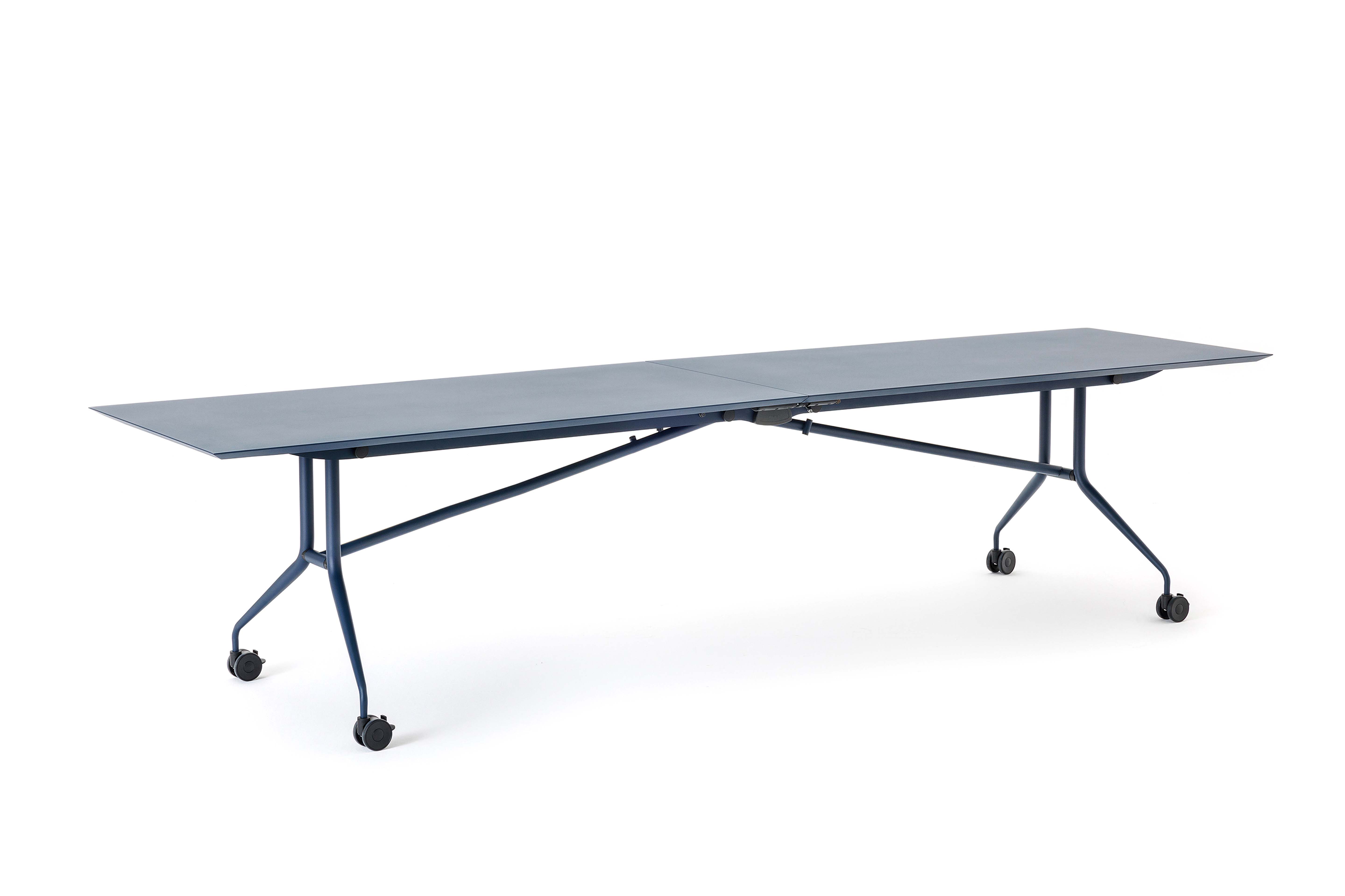 Funguje perfektně jako samostatný pracovní a konferenční stůl nebo integrovaný do (společných) pracovních prostor a konferenčních místností. Stůl je vybaven čtyřmi bržděnými plastovými kolečky. Je také dostupný jako kulatý či oválný stůl. Verze Metal pak nabízí desku stolu zhotovenou z kovu a stůl je tak vhodný i pro outdoorové použití.