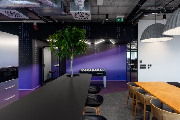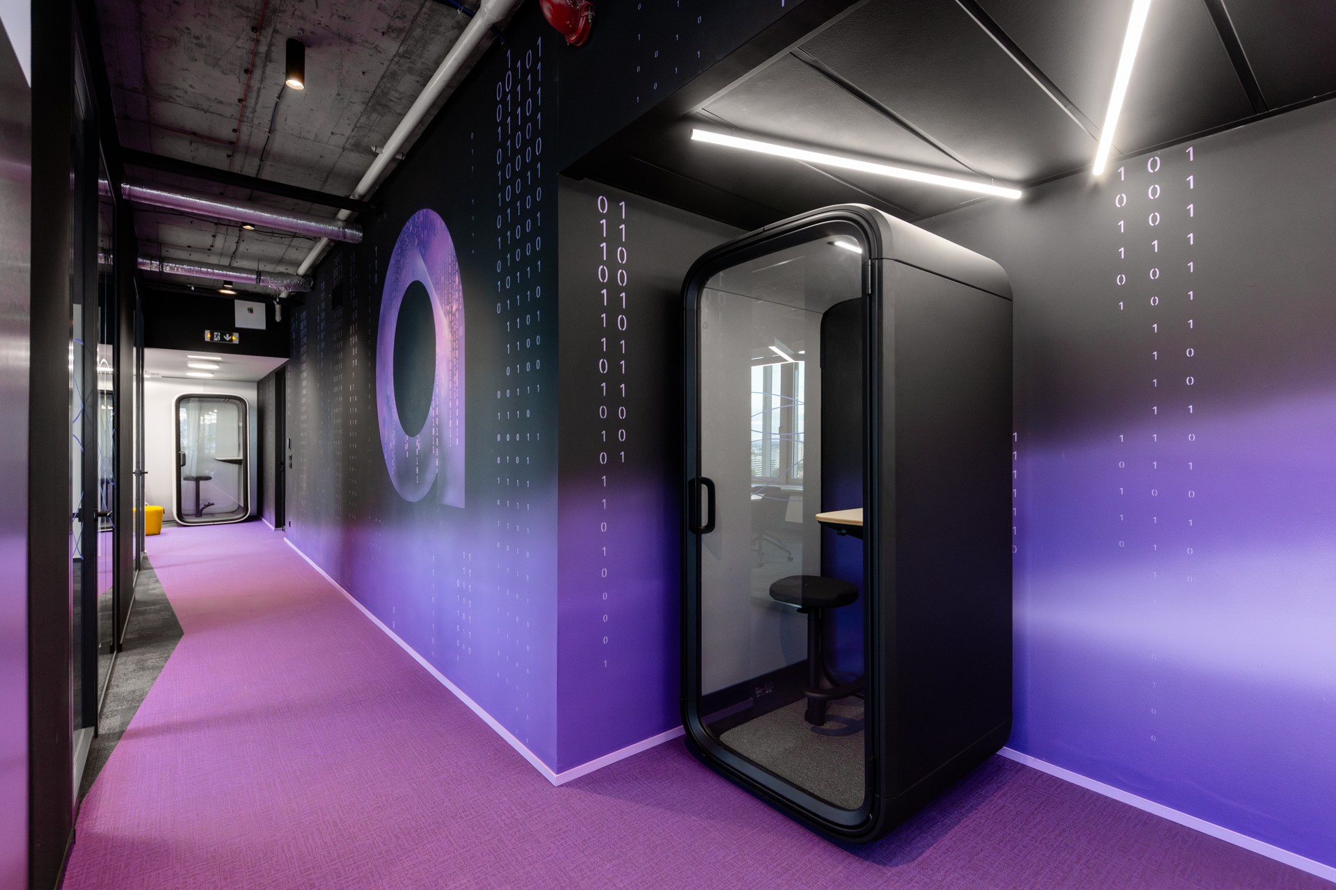 Sídlo společnosti v Bratislavě jsme pomohli vybavit akustickými budkami Framery One Compact, které jsou sice nejmenší z nabídky akustických budek této finské akustik-trendseterové společnosti, nicméně své uživatele dovedou překvapit chytře řešeným prostorem budky a její špičkovou výbavou. Pracovní místa tvoří naše stoly cre8 Puzzle v benchovém uspořádání a cre8 HA singl stoly s výškovou stavitelností s tichým spolehlivým a bezpečným pojezdem. Akustickou pohodu prostoru dotváří doplňky společnosti BuzziSpace, včetně přísedových puffíků BuzziCube Solo a Duo.