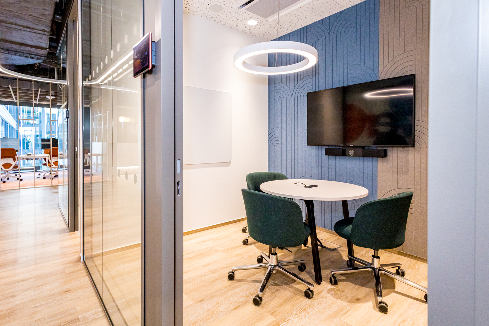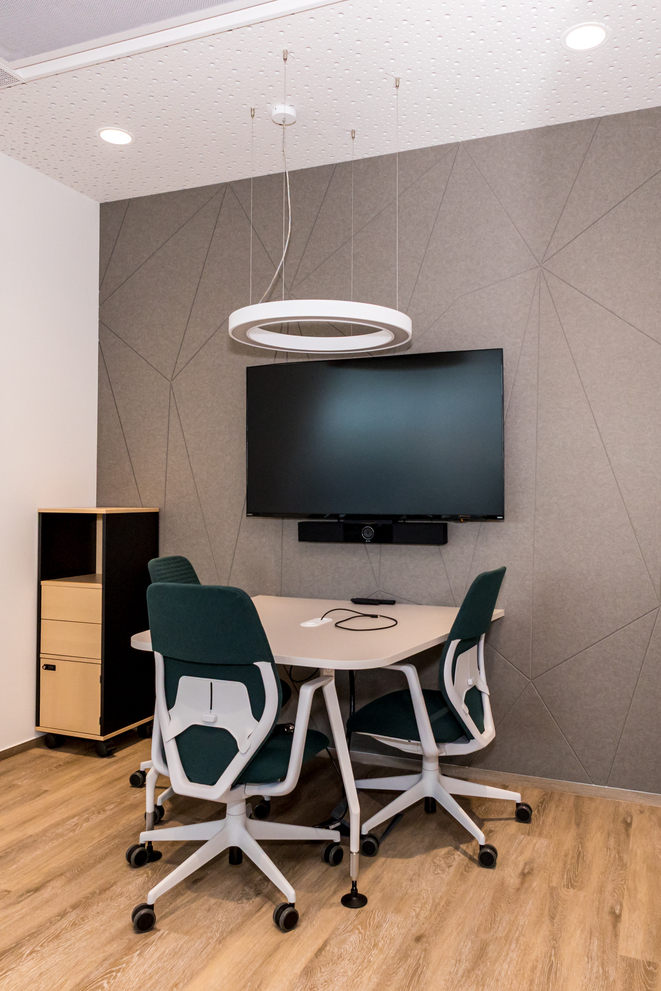 Proto zvolili jako klíčový produkt v kanceláři kvalitní pracovní ergonomické židle MIRRA od HermanMiller a to v nové paletě barev, nabízené teprve od roku 2025. Některá pracoviště jsme doplnili i kovovými kontejnery rovněž značky HermanMiller. Pro potřeby zasedacích místností jsme dodali také skvěle prodyšné židle SETU, jak jinak než z provenience HermanMiller. Akustické zatížení otevřených prostor pomáhá snižovat aplikace akustických panelů ECHOBOARD švýcarské společnosti EchoJazz, jejichž feltový materíál vyráběný recyklací PET drtě výrazně pohlcuje celé spektrum frekvencí, které by jinak narušovaly akustickou pohodu prostoru. Akustiku pomáhají řešit třeba i akustická sezení od španělského výrobce Sancal, jako např. jeho pohovka REW, nebo akustická světla BUZZIJET od belgické společnosti BuzziSpace. Krásným designovým a přitom plně funkčním doplňkem skleněné popisovatelné a zároveň magnetické tabule Lintex. Z rodiny produktů MillerKnoll stojí za zmínku i skandinávský čistý design společnosti Muuto, jejichž výrobky v tomto projektu zastupují světla STRAND nebo třeba velice pohodlná křesla WRAP LOUNGE.