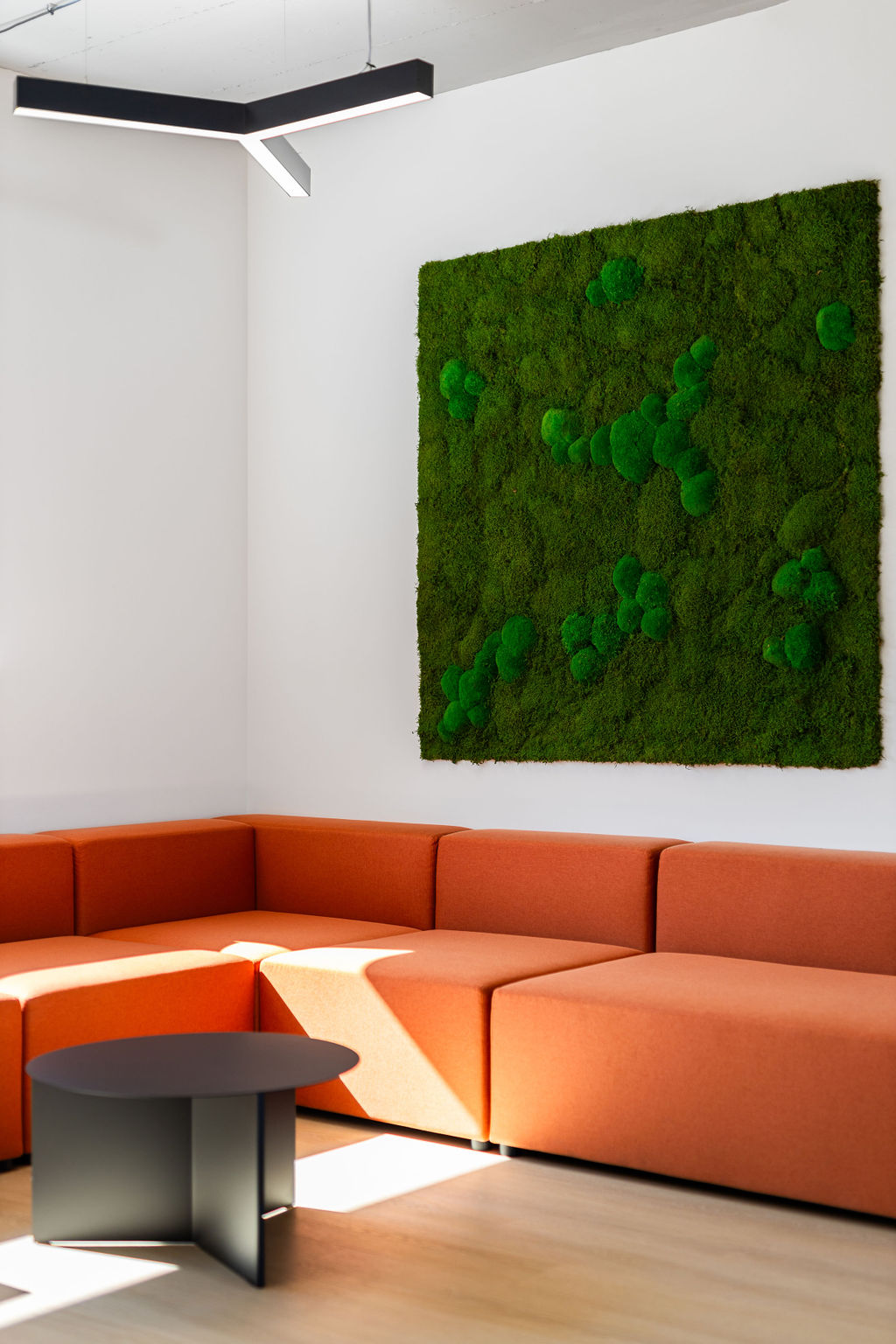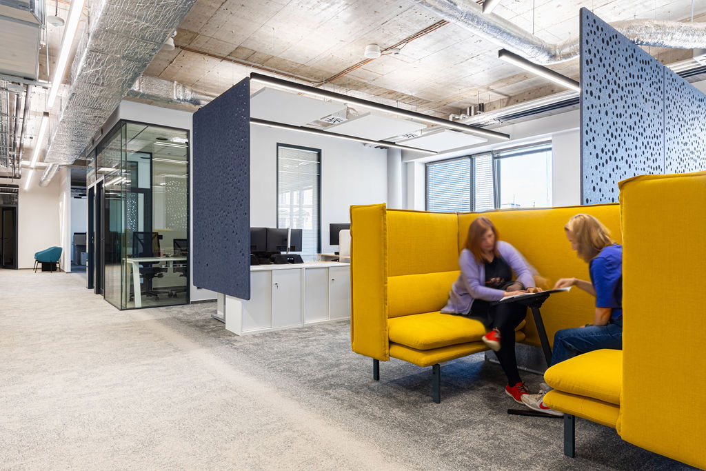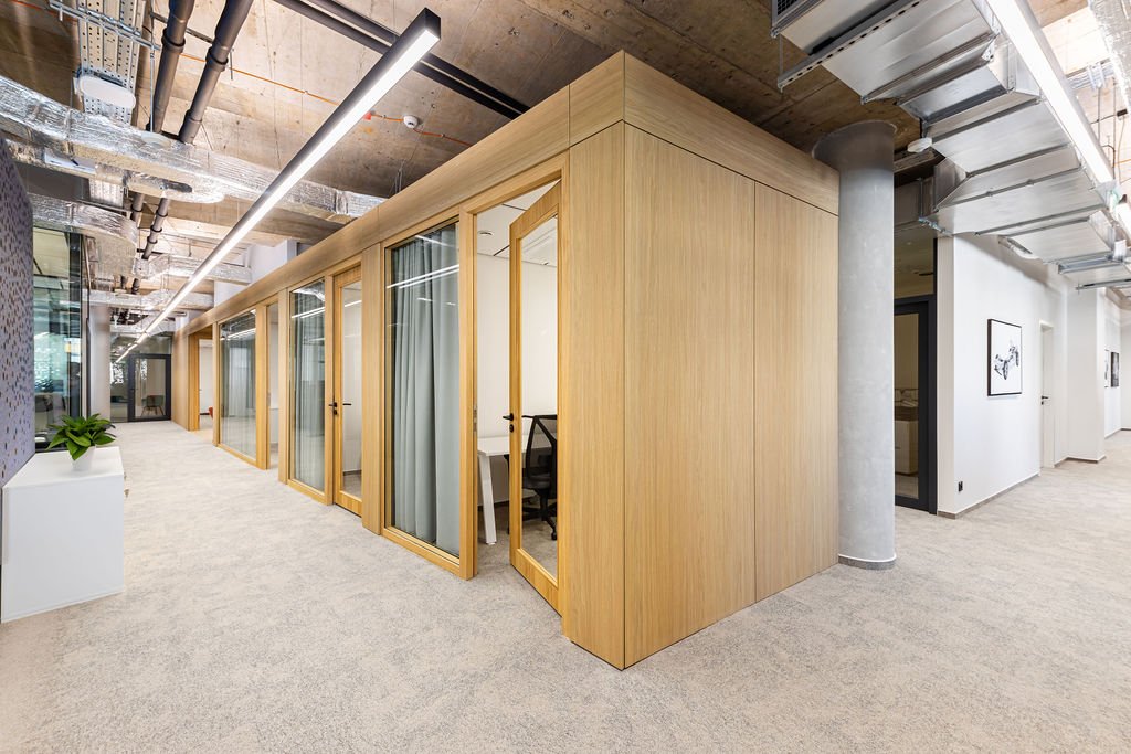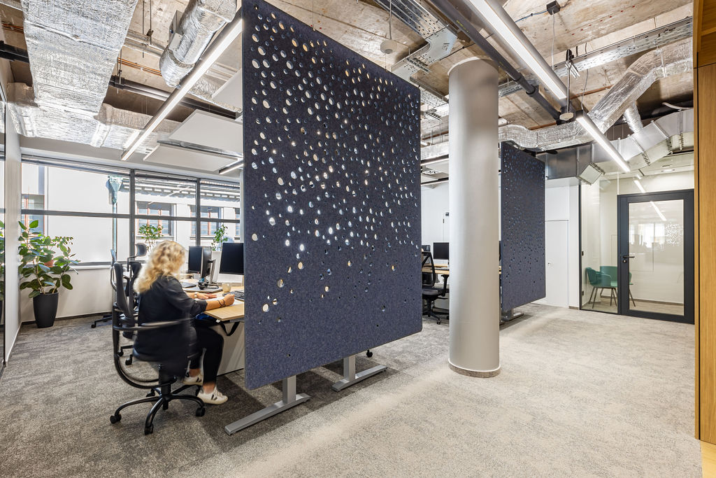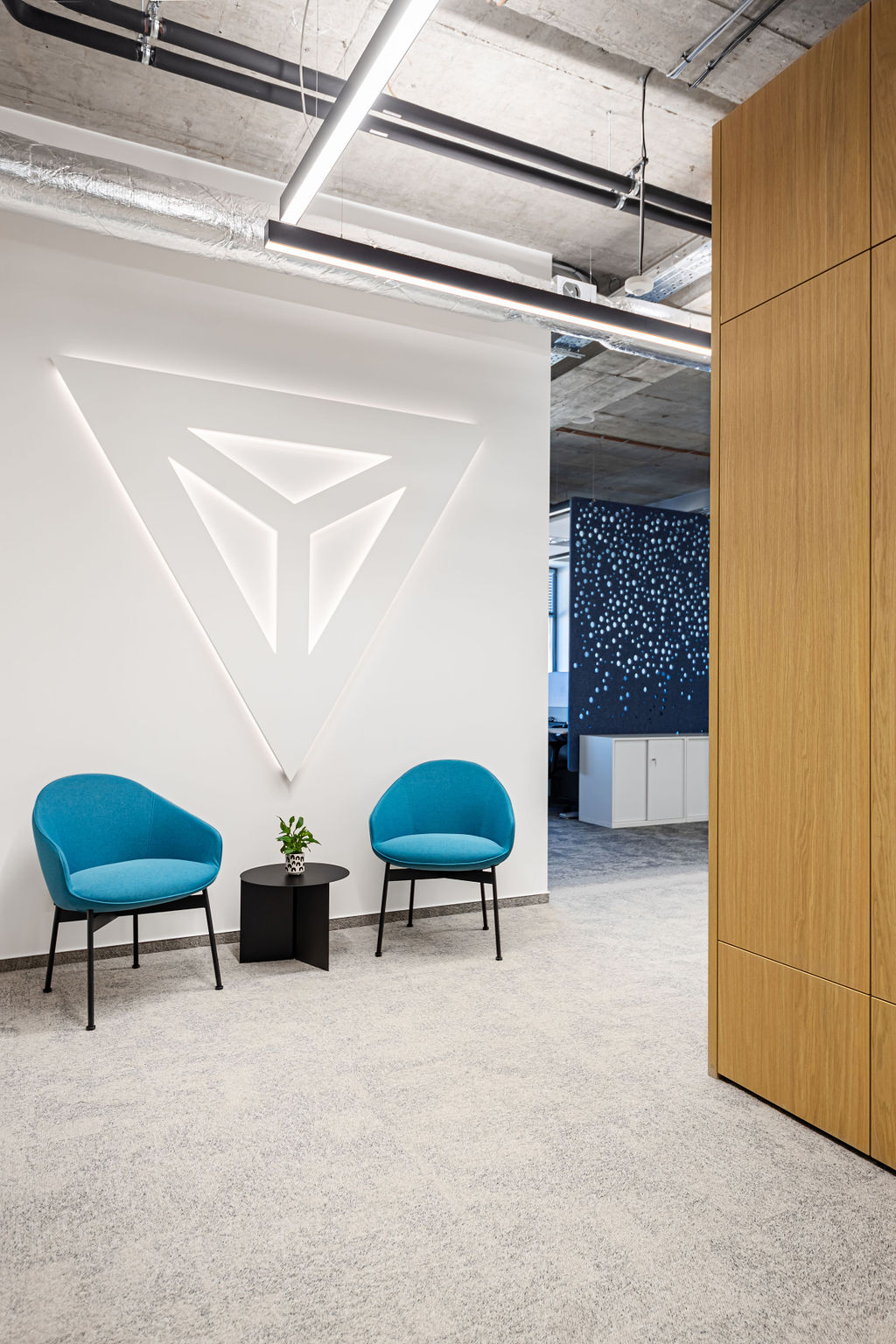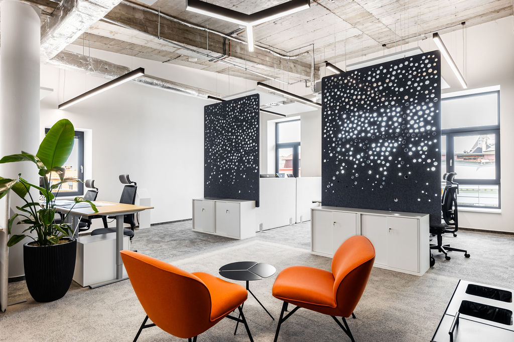Jsme hrdí, že jsme mohli v rámci tohoto projektu přispět námi nabízenými produkty k modernímu a ergonomicky příjemnému pracovnímu prostředí. Pro pracovní místa jsme dodali výškově stavitelné stoly z naší řady cre8 PUZZLE s kabelovým managementem, doplněné pojízdnými kovovými kontejnery HermanMiller. Jednacími stoly stejné řady cre8 PUZZLE s označením Endow jsou vybaveny i zasedací místnosti. Akustickou a zároveň estetickou i dělící roli plní zavěšené panely ECHOCURTAIN od švýcarské společnosti EchoJazz, která z recyklovaného materiálu PET vyrábí nejrůznější designové produkty vylepšující akustickou pohodu v otevřených místnostech. Akustická je i pohodlná pohovka REW od španělské firmy Sancal. Celkový koncept pak doplňují židle LOTTUS a stolky PUNTO a BURIN také od španělských společností Enea a Viccarbe.