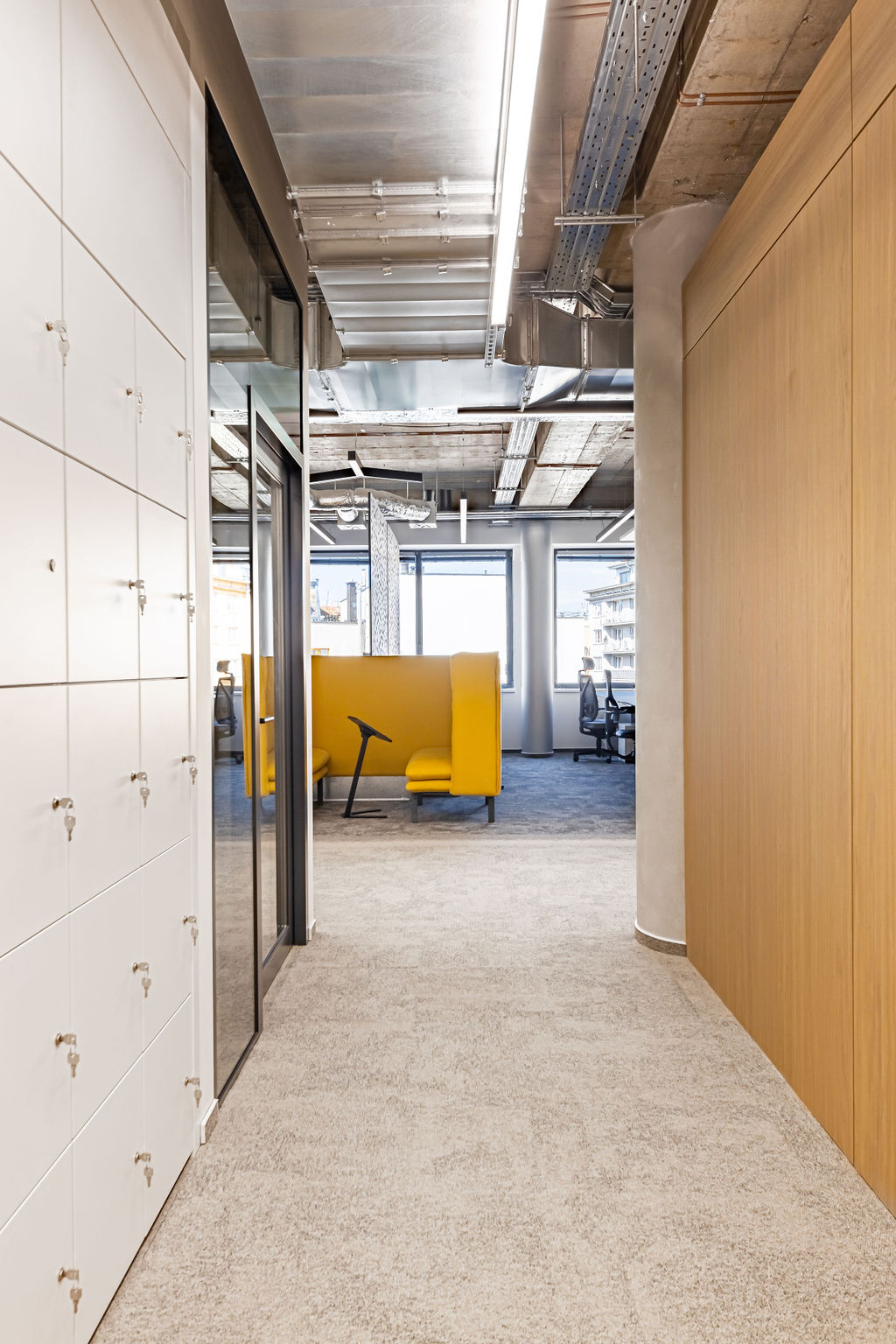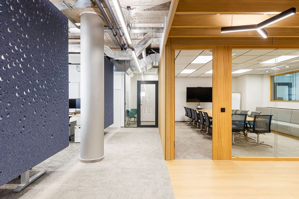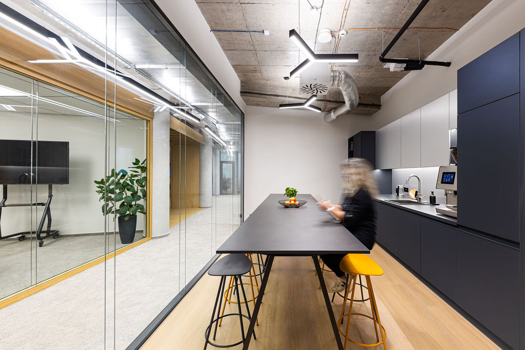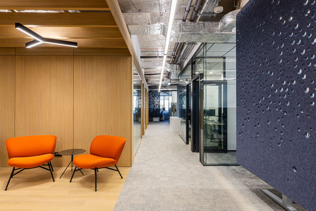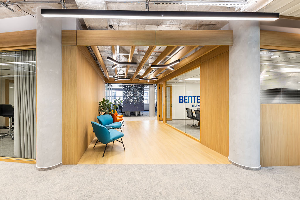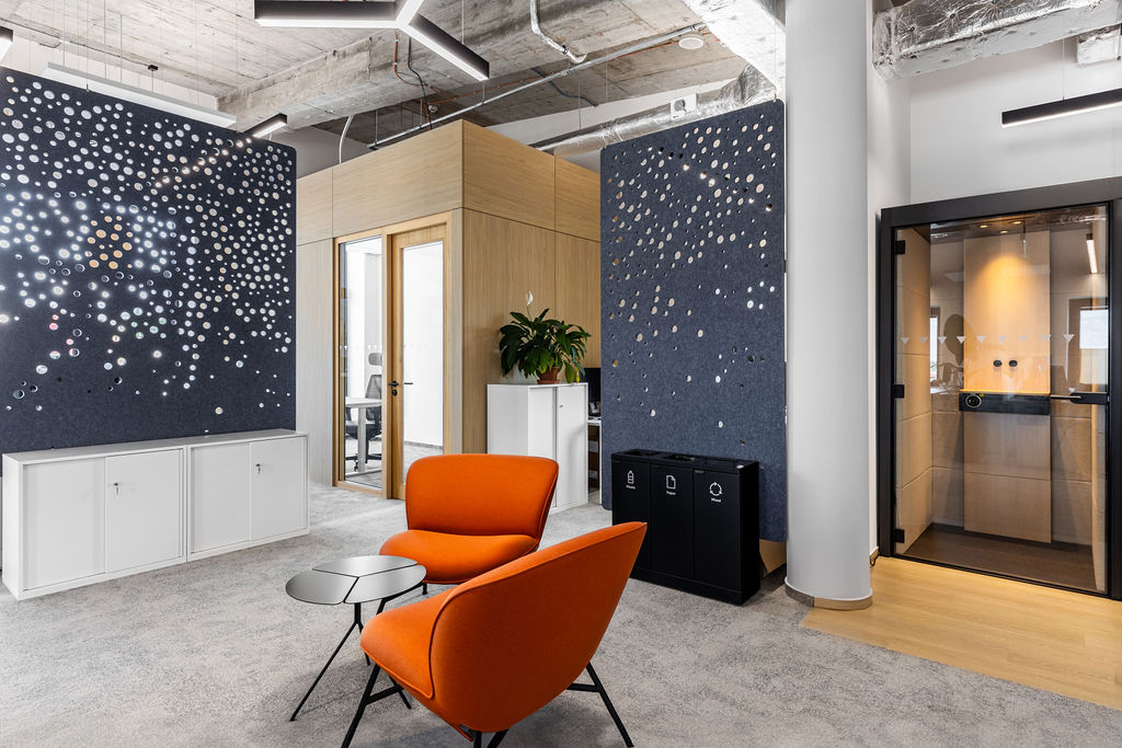 Jsme hrdí, že jsme mohli v rámci tohoto projektu přispět námi nabízenými produkty k modernímu a ergonomicky příjemnému pracovnímu prostředí. Pro pracovní místa jsme dodali výškově stavitelné stoly z naší řady cre8 PUZZLE s kabelovým managementem, doplněné pojízdnými kovovými kontejnery HermanMiller. Jednacími stoly stejné řady cre8 PUZZLE s označením Endow jsou vybaveny i zasedací místnosti. Akustickou a zároveň estetickou i dělící roli plní zavěšené panely ECHOCURTAIN od švýcarské společnosti EchoJazz, která z recyklovaného materiálu PET vyrábí nejrůznější designové produkty vylepšující akustickou pohodu v otevřených místnostech. Akustická je i pohodlná pohovka REW od španělské firmy Sancal. Celkový koncept pak doplňují židle LOTTUS a stolky PUNTO a BURIN také od španělských společností Enea a Viccarbe.
