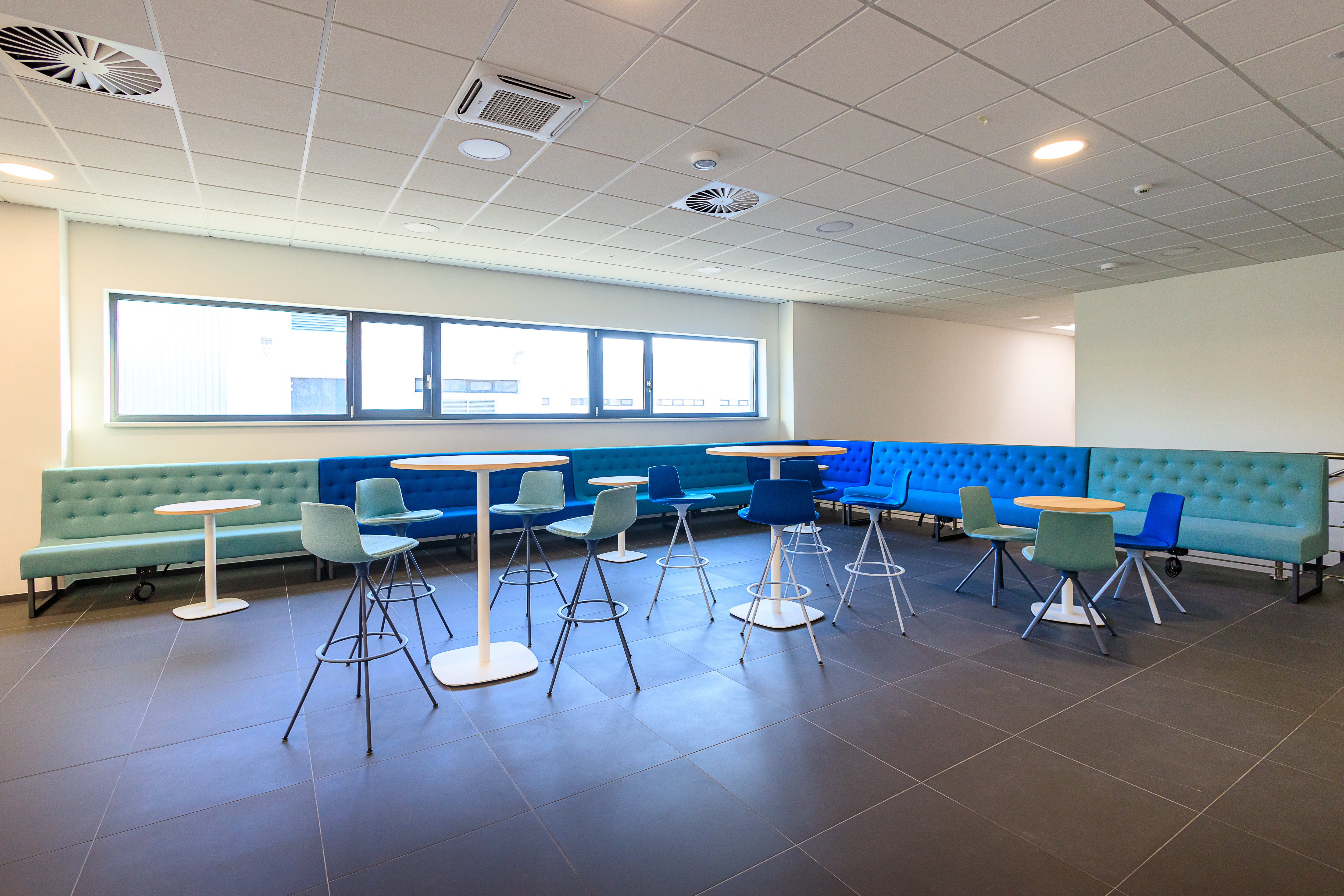 Společnost Continental využívá celé patro industriální výrobní haly jako nové kanceláře. Flexibilní pracoviště se mohou pochlubit výškově stavitelnými stoly cre8 Flexi vybavené paravány, které v otevřeném prostoru kanceláří v kombinací s akustickými budkami Framery Q vytváří ideální řešení potřebného soukromí na otevřeném pracovišti. Nechybí ani dostatečné množství zasedacích místností vybavených převážně konferenčními stoly HermanMiller Civic s vestavěnou elektrifikací. Akustický komfort, jak už je u nás zvykem, zajišťují produkty značky BuzziSpace, ať už se jedná o efektivní využití akustických světel nebo obkladů stěn. Díky širokému spektru nabízených barev je celý interiér vybaven v barvách dle interních předpisů CI. Kancelářský prostor je od kavárenské části oddělen vysoce flexibilní příčkou značky MAARS, kterou je možno vybavit různou směsicí panelů, zde jsme volili kombinaci mechu a látkových ploch s polopropustnými plechovými panely s perforací. Útulnost prostoru dotváří polstrované židle Sancal Tea a opět stoly Civic, tentokrát ve verzi kulatých jídelních stolků. Dominantou celého prostoru jsou výrazná akustická světla BuzziSpace BuzziBell.