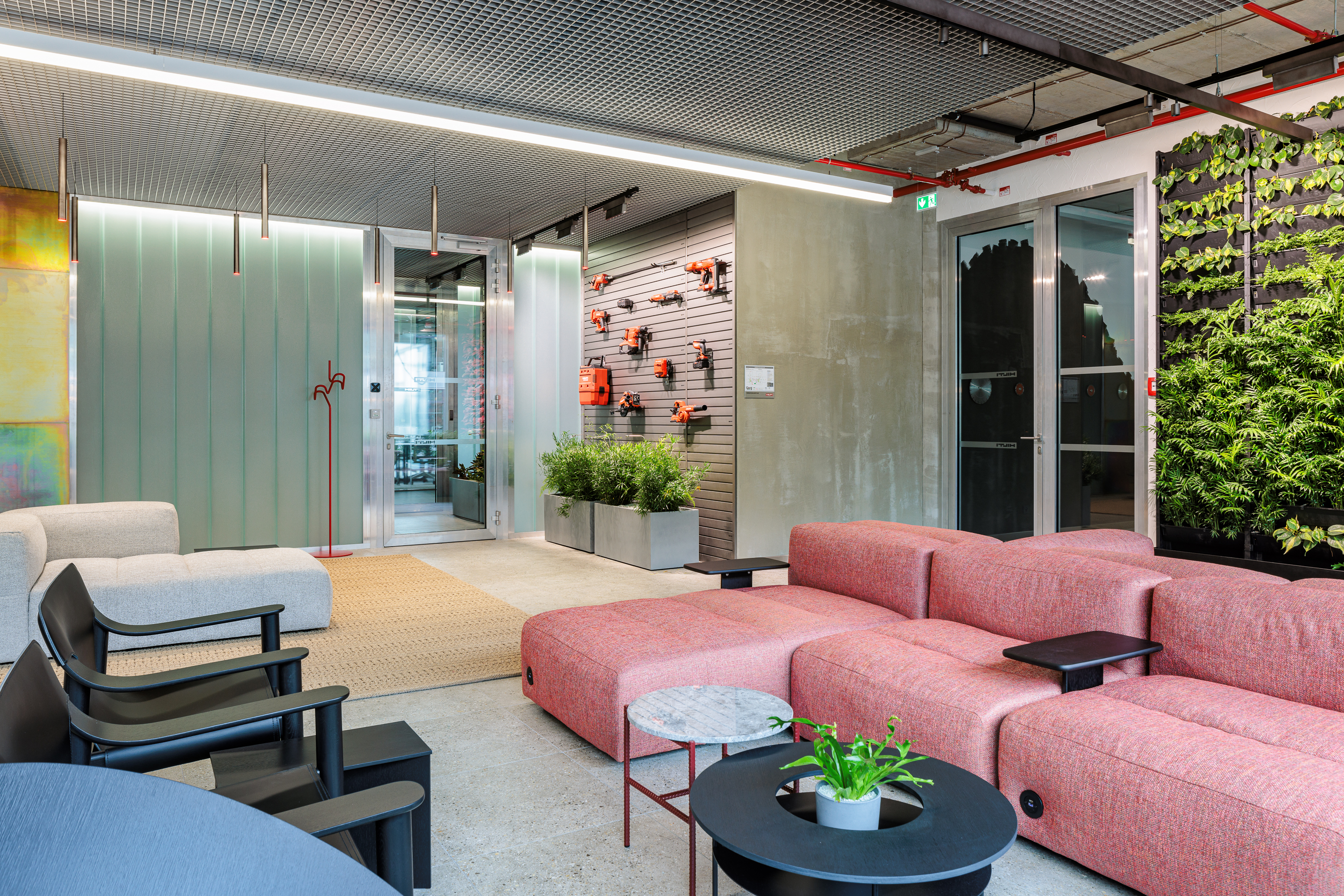 Společnost Hilti - světoznámý výrobce nejen stavební techniky a nářadí - se letos přestěhovala z Čestlic na pražský Chodov do areálu The Park. Nové kancelářské prostory vzhledem k zaměření společnosti přímo vybízely k jednoduché koncepci surového industriálního designu. Jsme rádi, že jsme jako cre8 mohli být při této krásné realizaci a přispět k vybavení nového prostoru našimi osvědčenými produkty z oblasti akustiky, ergonomie a nábytkového designu. Dominantou v prostoru jsou určitě akustické budky Framery, ozvláštněné tím, že bylo vypuštěno klasické venkovní opláštění, a tak budky přiznávají materiál, ze kterého jsou vyrobené a ladí tak s konceptem obnažených stěn a příček z přiznaných stavebních materiálů. Dalšími prvky, které pomáhají řešit akustiku kanceláří jsou obklady stěn a stropů z produkce společnosti EchoJazz. Tyto prvky vyrobené z recyklovaných PET lahví výrazně pomáhají pozitivně ovlivnit akustickou pohodu místností a navíc mají punc udržitelnosti. Samotná pracovní místa a zasedačky jsou vybavená ergonomickými židlemi COSM s naprosto jednoduchým automatickým systémem nastavením "na jedno tlačítko", vhodné pro sdílení pracovních míst a sit-stand stoly NEVI. Oba produkty od HermanMiller. Od této značky doplňují prostor také špičkové meetingovky SETU a výškově stavitelné stoly OE1. Novinkou od společnosti Hay použitou poprvé v projektu jsou robustní meetingové stoly BOA s rafinovaným systémem kabelového managementu. Oblast softseatingu a designového nábytku pak zastupují námi tradičně používané značky Arper, Sancal a Viccarbe, ale nebáli jsme se experimentovat a použít v interiéru méně známé značky a české výrobce, například firmu Master&Master a jejich signifikantní křeslo COCON, nebo společnost Betoni, od které jsme do prostoru umístili betonové květináče. Ty jen podtrhly odladěný stavební look nového prostoru.