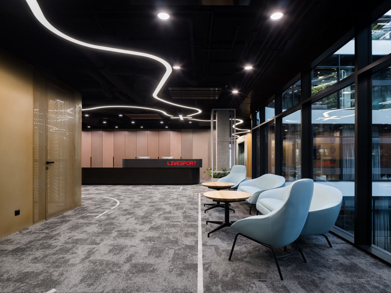Nové kanceláře společnosti Livesport kombinují sport a moderní technologie, navazují na předchozí patra. Prostor dále rozvíjí sportovní myšlenky – inspirací tentokrát byla tréninková dřina. Interiér je inspirován tělocvičnou, kterou pomocí cvičebních pomůcek přizpůsobíme tréninku kancelářských činností. Tělocvičnu definuje plocha kobercových čtverců a pravidelný rastr bodových svítidel. Prostor doplňují tři nosné prvky: lajny v podlaze, sportovní náčiní a elektronická tužka.