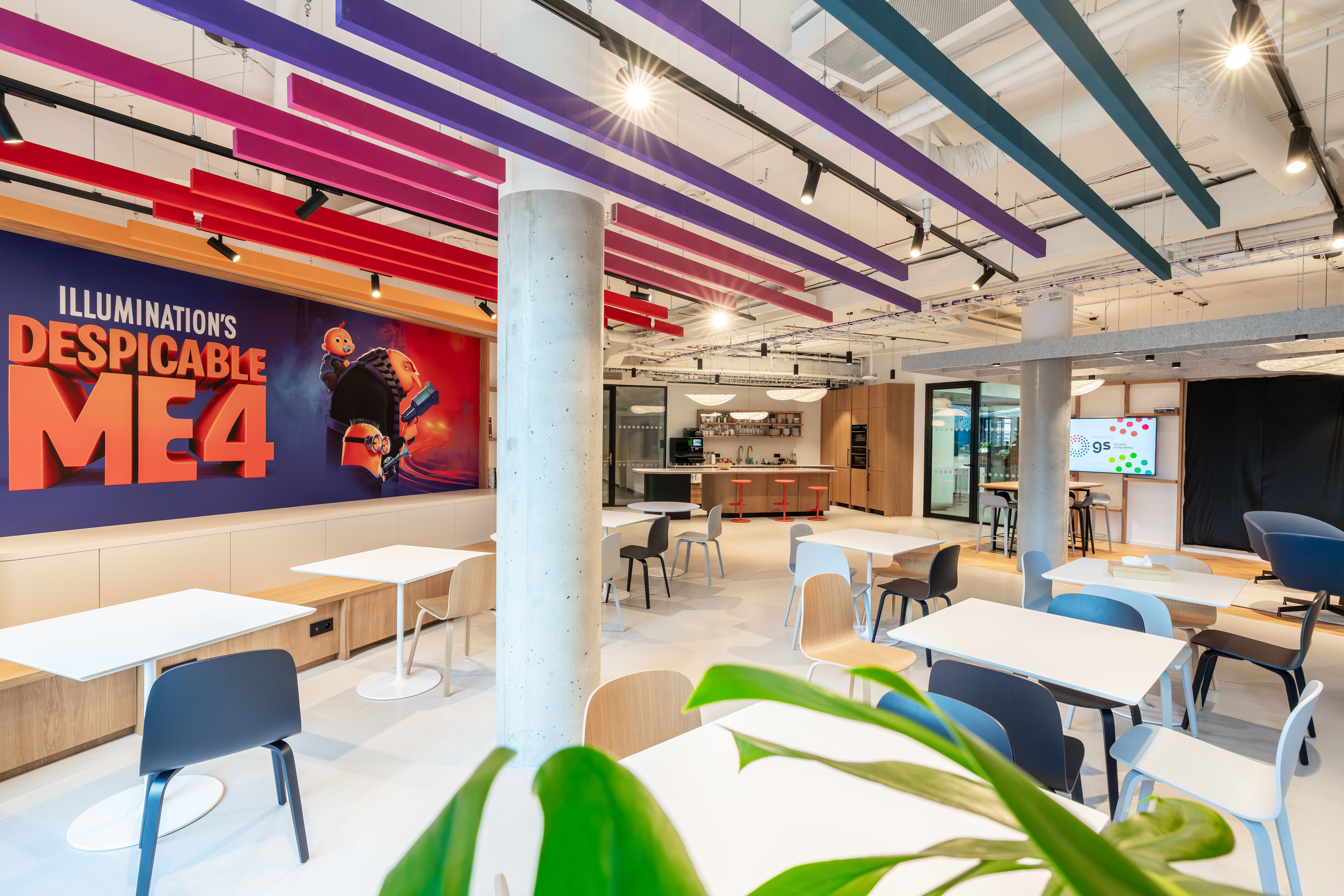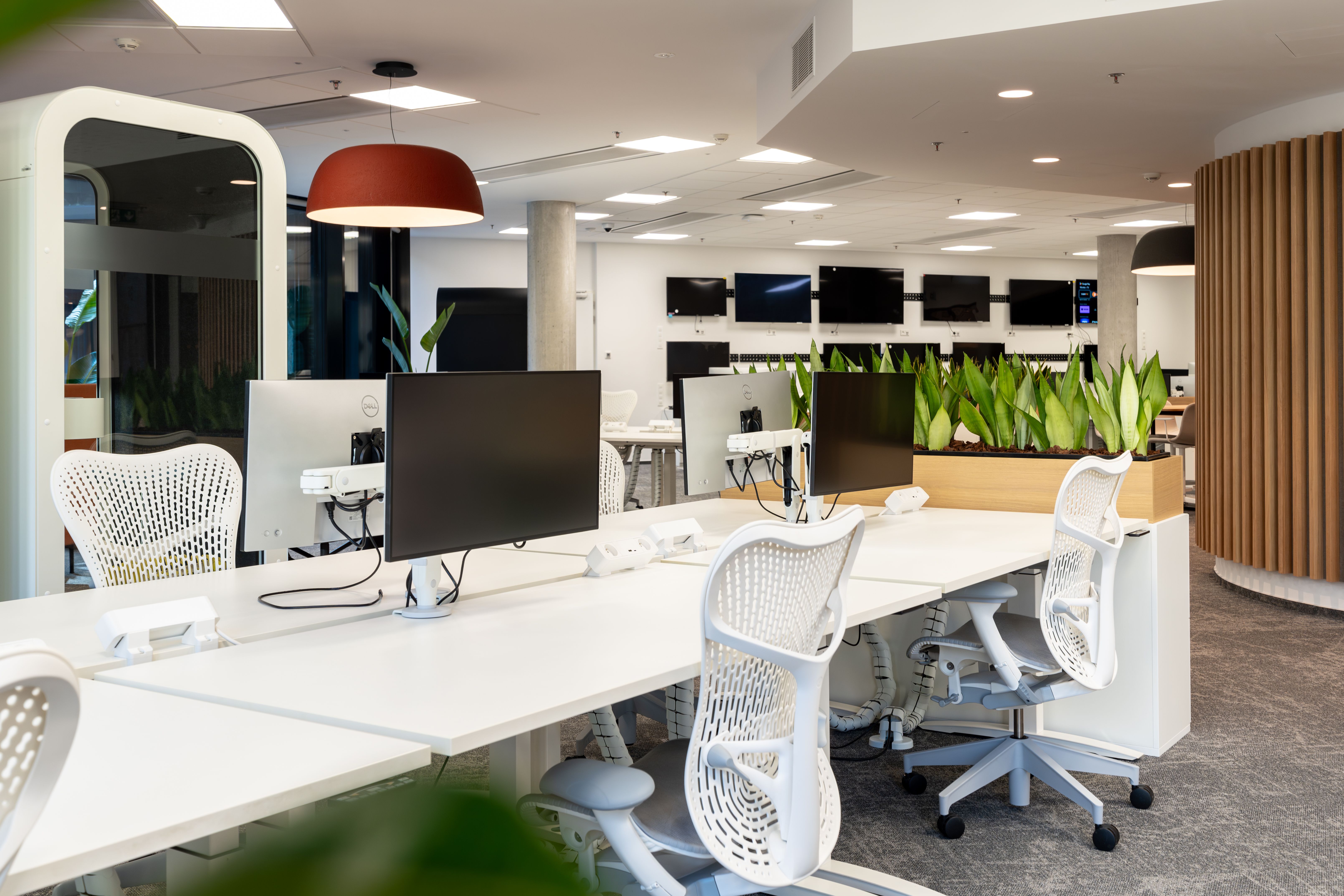 Pracovnímu prostoru vévodí ergonomické židle HermanMiller MIRRA, které už dle svého jména dokonale zrcadlí pohyb uživatele a poskytují mu tak maximální a správnou ergonomickou podporu během dlouhodobého sezení. V kombinaci s výškově stavitelnými stoly NEVI a rameny na monitor OLLIN tvoří dokonalé moderní pracoviště. Akustický komfort pomáhají zajišťovat v otevřeném prostoru produkty značek Framery a EchoJazz. Oblast softseatingu zastupují designové kousky značek Arper, Muuto a HAY. Sklopné skladné stoly Trilogy pomáhají řešit flexibilitu prostoru a nabízejí svou mobilitou nové možnosti set upu místností.