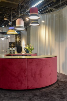 Create your own unique BuzziHat by choosing from 4 sizes, 4 metal shades, 4 metal ring colors, and 375 fabrics. Mix-and-match finishes fitting other furniture in the same space whether office, hospitality or lobby settings. Different sizes absorb more or less sound. The bottom hides all electrical components, while the top part acts as a high performant sound-absorbing element. Combine different sizes of BuzziHats for the ideal acoustic solution.