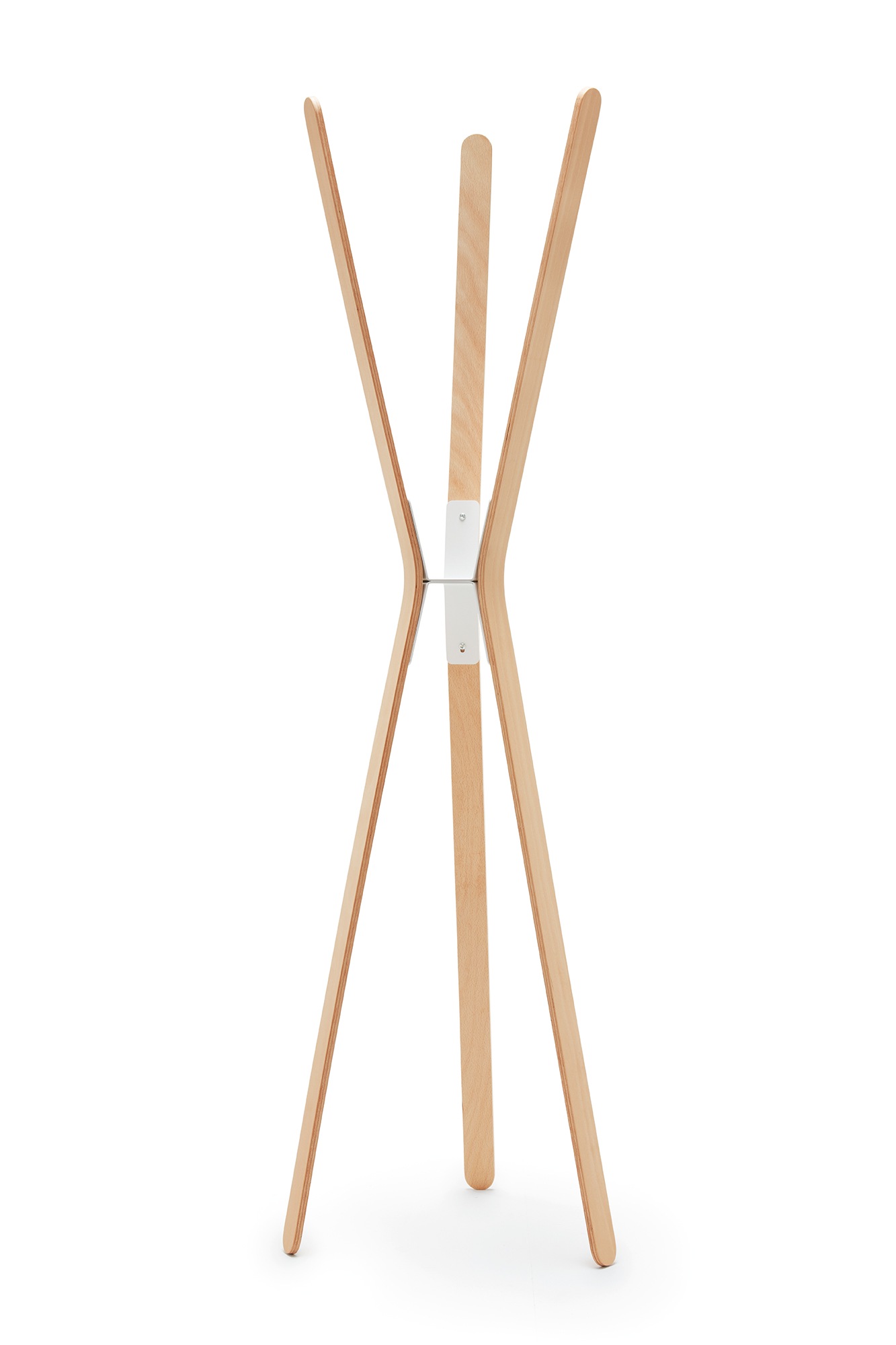 Coat stand made of 3 or 6 curved beechwood slats. Minimalist design to integrate into a variety of environments, homes, offices and retail. Wall version in metal available.