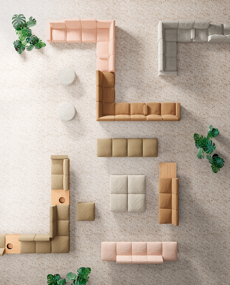Sistema is a modular sofa system by Lievore Altherr Molina, designed for maximum flexibility in both indoor and outdoor collaborative spaces. Available in Floor or Legs versions, Sistema adapts to any layout with options for seats, backrests, legs, armrests (wooden or upholstered), and upholstery in Smooth or Soft finishes. While Sistema Legs offers electrification and accessories like tables or poufs, the outdoor Floor version focuses on simplicity and comfort, with 2–3 seats, medium backrests, and no add-ons.