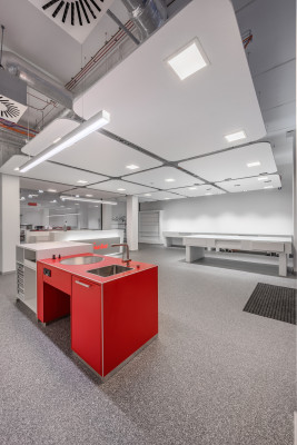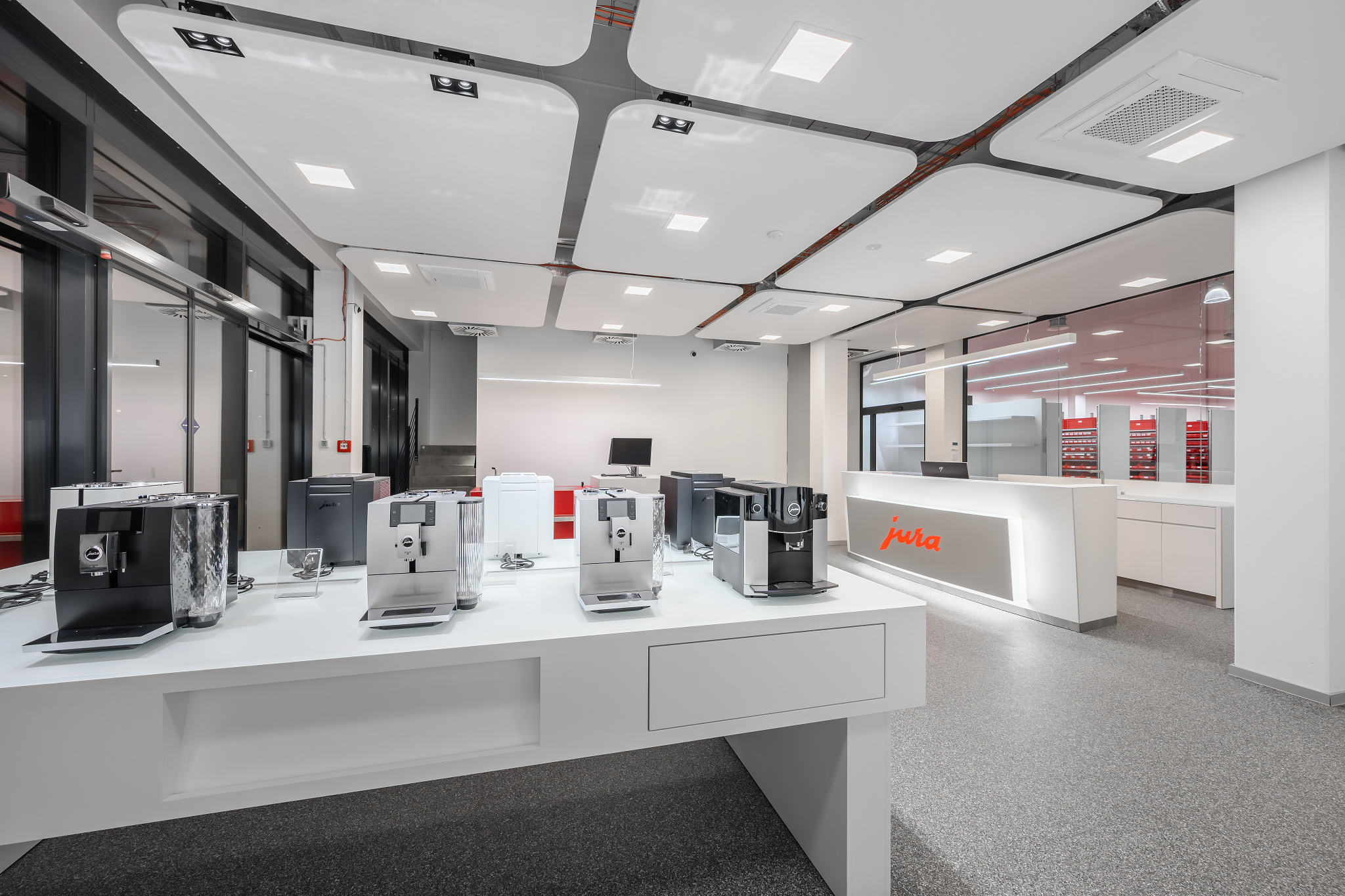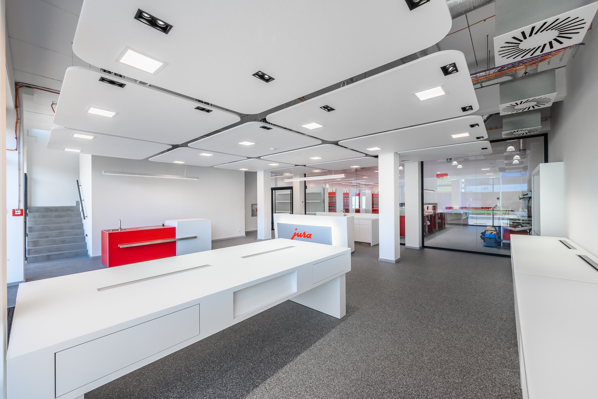 Jura - a renowned Swiss manufacturer of coffee machines approached us to help him arrange his new premises. The project was exceptional in its complexity. We not only furnished office and meeting rooms, but also the interior of the retail and service part, where the emphasis was on ergonomics, acoustics and the most efficient and at the same time comfortable working environment. Everything is perfectly coordinated in a uniform corporate visual style, and the interior is dominated by silver gray with white and red. We traditionally solved acoustics with elements from the portfolio of BuzziSpace and EchoJazz, which complemented the Desso carpets. From office furniture from HermanMiller, the bright red ergonomic Cosm work chair with fully automatic mechanics attracts attention as a distinctive design element. The massive Picnic meeting table from BuzziSpace also acts as an important solitaire in the space. With its original design, the entire space is completed by pieces from Hay and Enea.